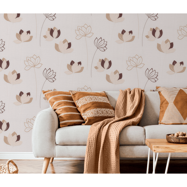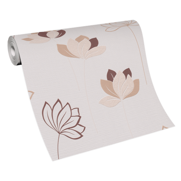 Vlies hátoldalú, virág mintás, beige-barna színű tapéta, felragasztásához speciális vliestapéta ragasztó használata javasolt.