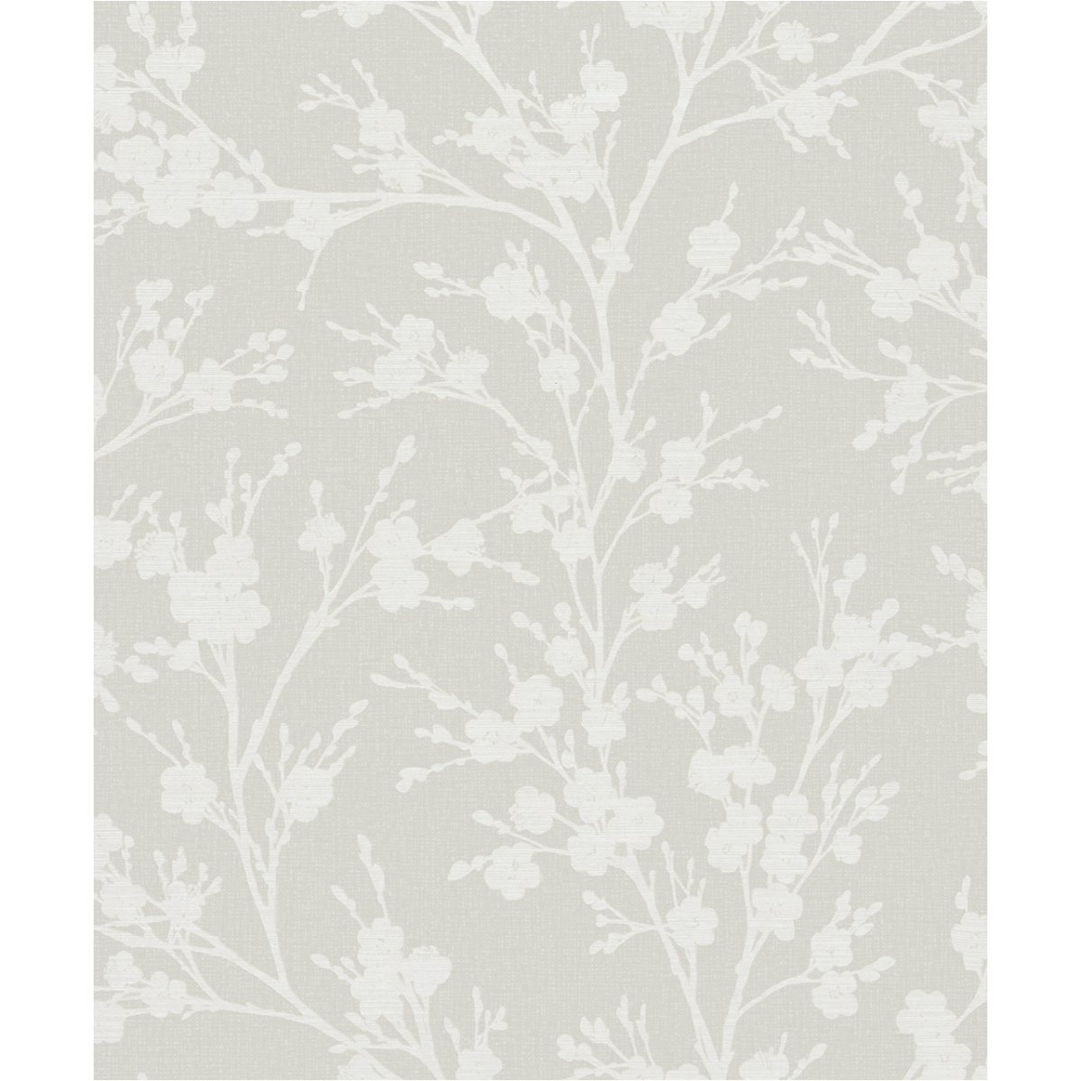 Vlies alapú habtapéta szürke-fehér virágmintával.