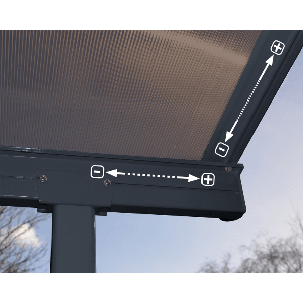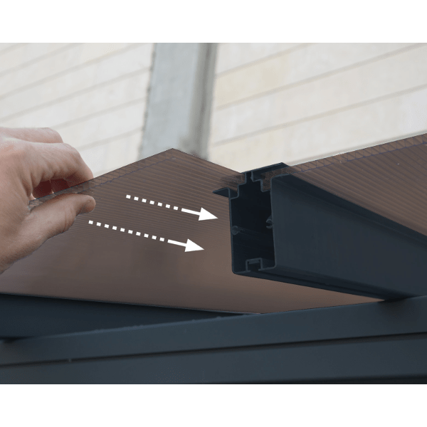 Esztétikus fedési megoldás– számos kültéri használatra, terasz, kocsibeálló vagy napozó terület fedésére. • Anyaga ellenáll az időjárásnak, vízzáró és karbantartást nem igényel. - esztétikus, gyönyörű kültéri pihenőhelyet biztosít • A tartóoszlopok és a fali szerelvény állíthatóak, így minden igénynek megfelelnek • Gyakorlatilag törhetetlen, 6mm-es UV ellenálló polikarbonát tetőpanelek • Panel színe: füst • Nem sárguló UV védett tetőpanelek • Rendkívül tartós és korrózióálló porszórt kivitelű alumínium profilok és galvanizált acél csatlakozó • Beépített ereszcsatorna és állítható kifolyók (átmérő 50 mm) • Talajhoz rögzítő készlet tartozék • Egyszerű összeszerelés – csúsztatható tetőpanelek • Széles méretválaszték • Világító rendszer a tetszetős megvilágítás érdekében (külön kapható)