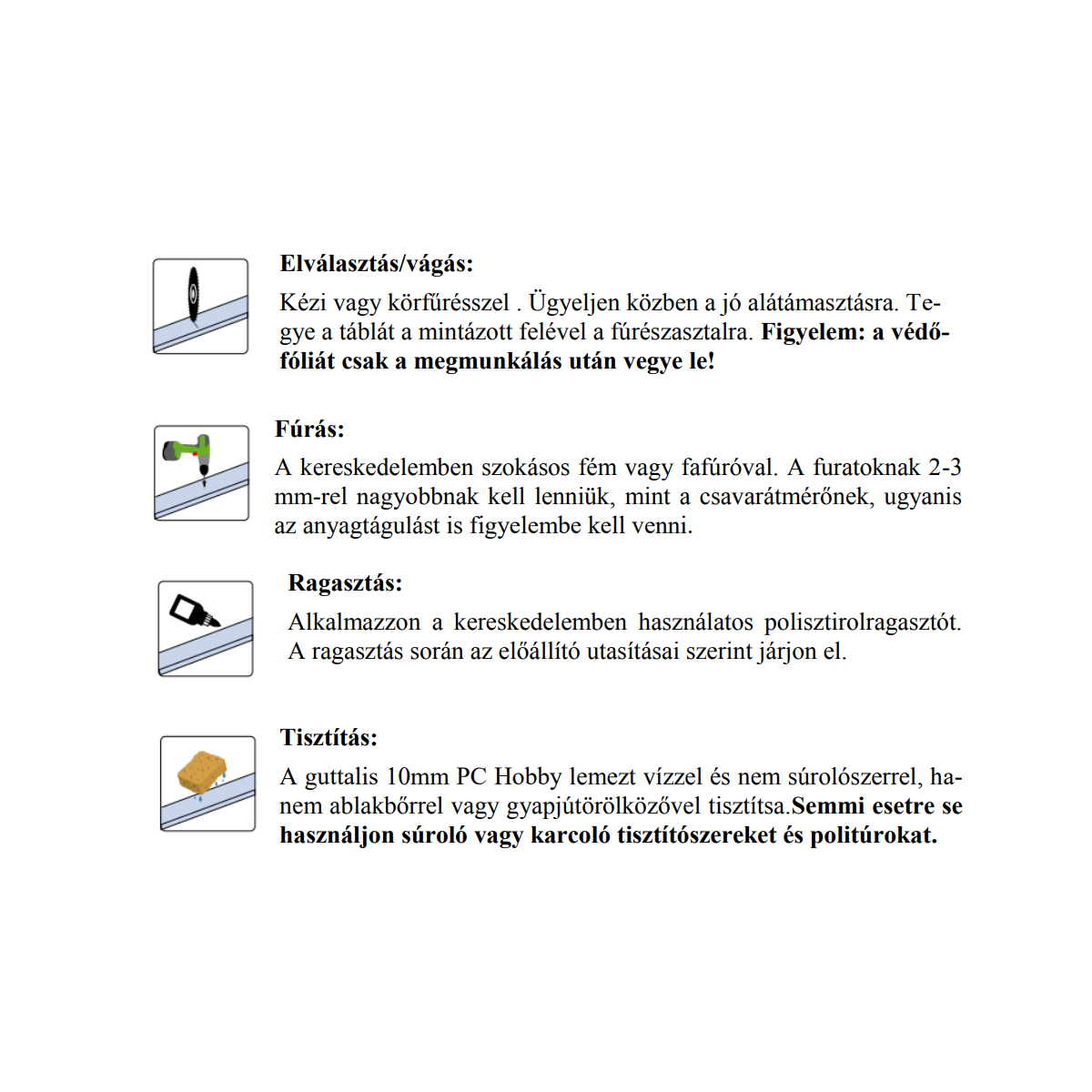 A hobby polikarbonát lemez átlátszó, többrétegű kivitelben készült, amely fényáteresztő tulajdonságának köszönhetően ideális beltéri felhasználásra és hobbi célokra. A 2000×1050×10 mm-es méretű tábla 2,1 m² fedőfelületet biztosít. Kiváló minőségű műanyag, rugalmas és nem szilánkosodik.