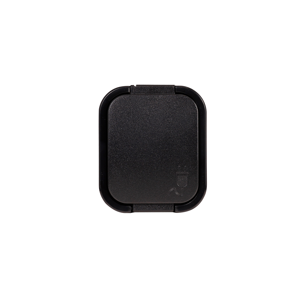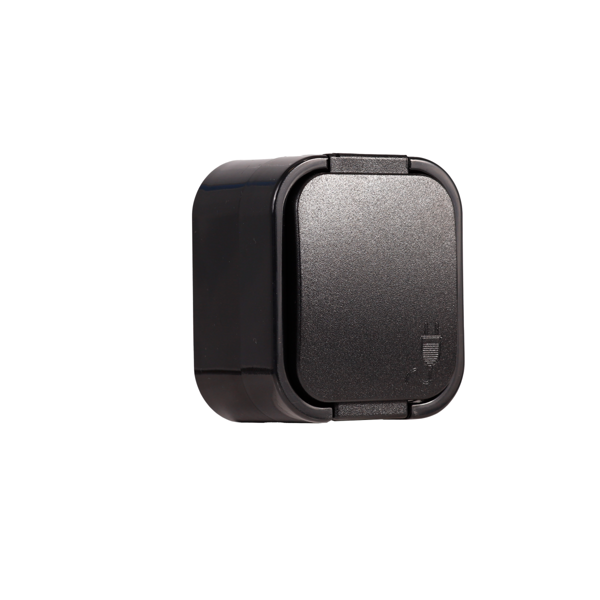 Modern megjelenésű, fekete színű, földelt dugaszolóaljzat. Falon kívüli szerelésű kivitel, csapófedéllel. IP54 védelmével megoldást kínál az olyan helyeken történő felhasználásra ahol fontos a nedvesség (fröccsenő víz ellen védett minden irányból) és por elleni védelem (nem károsító mértékű behatolás megengedett). Csavaros bekötésű. 16 A; 250 V; 60Hz.
