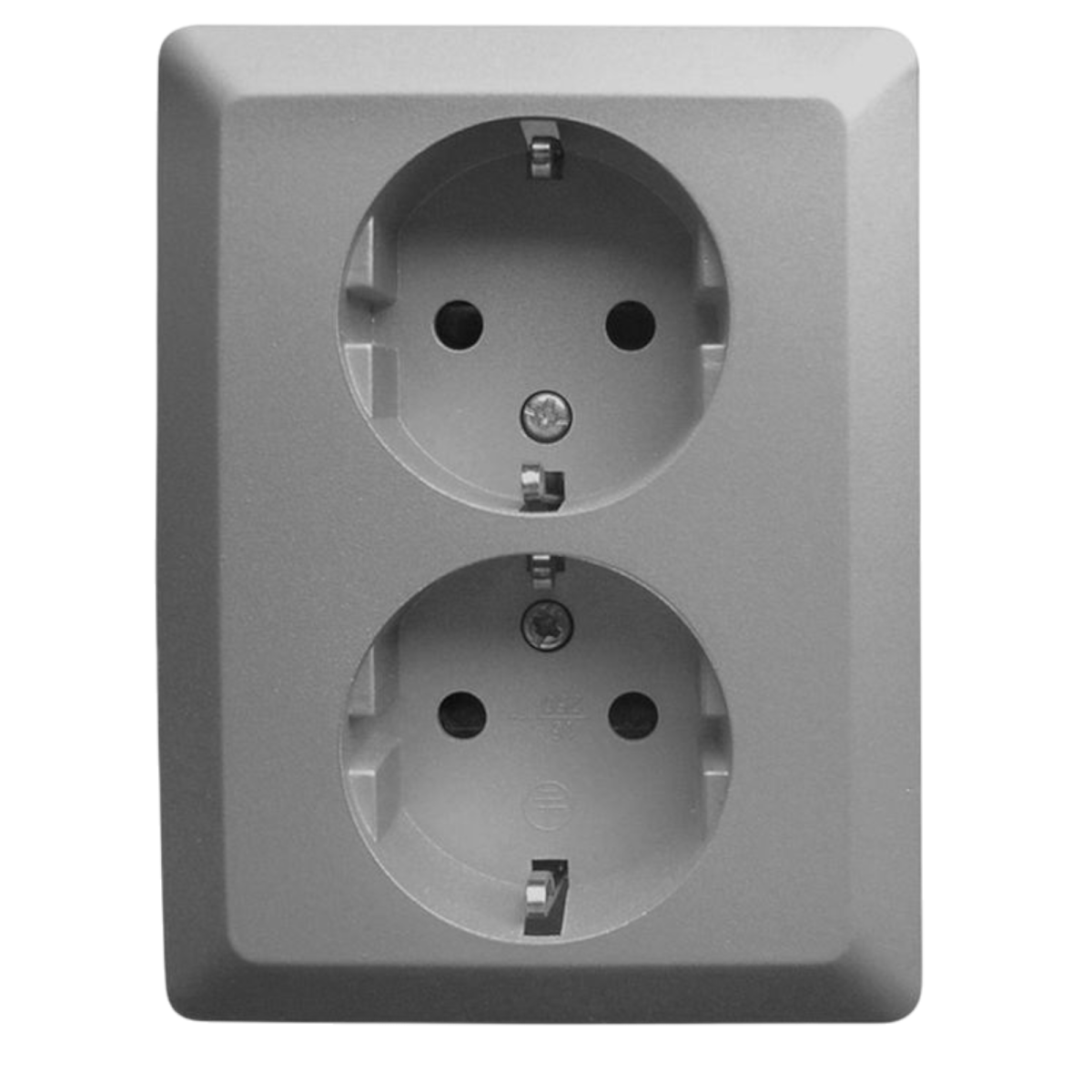 Olympic süllyesztett dupla, földelt dugalj kerettel, gyermekvédelemmel sötét szürke színben. IP20 védelem: beltéri használatra, 16A, 250V, 60Hz.