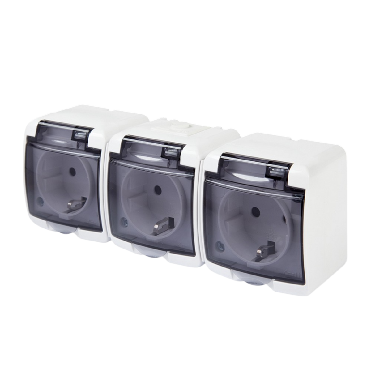 Aquastar földelt hármas dugaszolóaljzat kültéri használatra. Fehér színű, komplett, falon kívüli kivitelezésben. A könnyen szerelhető és egyszerűen telepíthető falon kívüli szerelvény ideális a fő szerelvényezéshez és a házi villanyszerelés egyszerű utólagos szerelvényezéséhez. Kiváló minőségű anyagok felhasználásával készült így hosszú élettartamot garantál. IP54 védettségi fokozatának és csapófedelének köszönhetően ideális kültéri használatra, ellenáll a por és víz behatolásának. 16A, 250V, 60Hz.