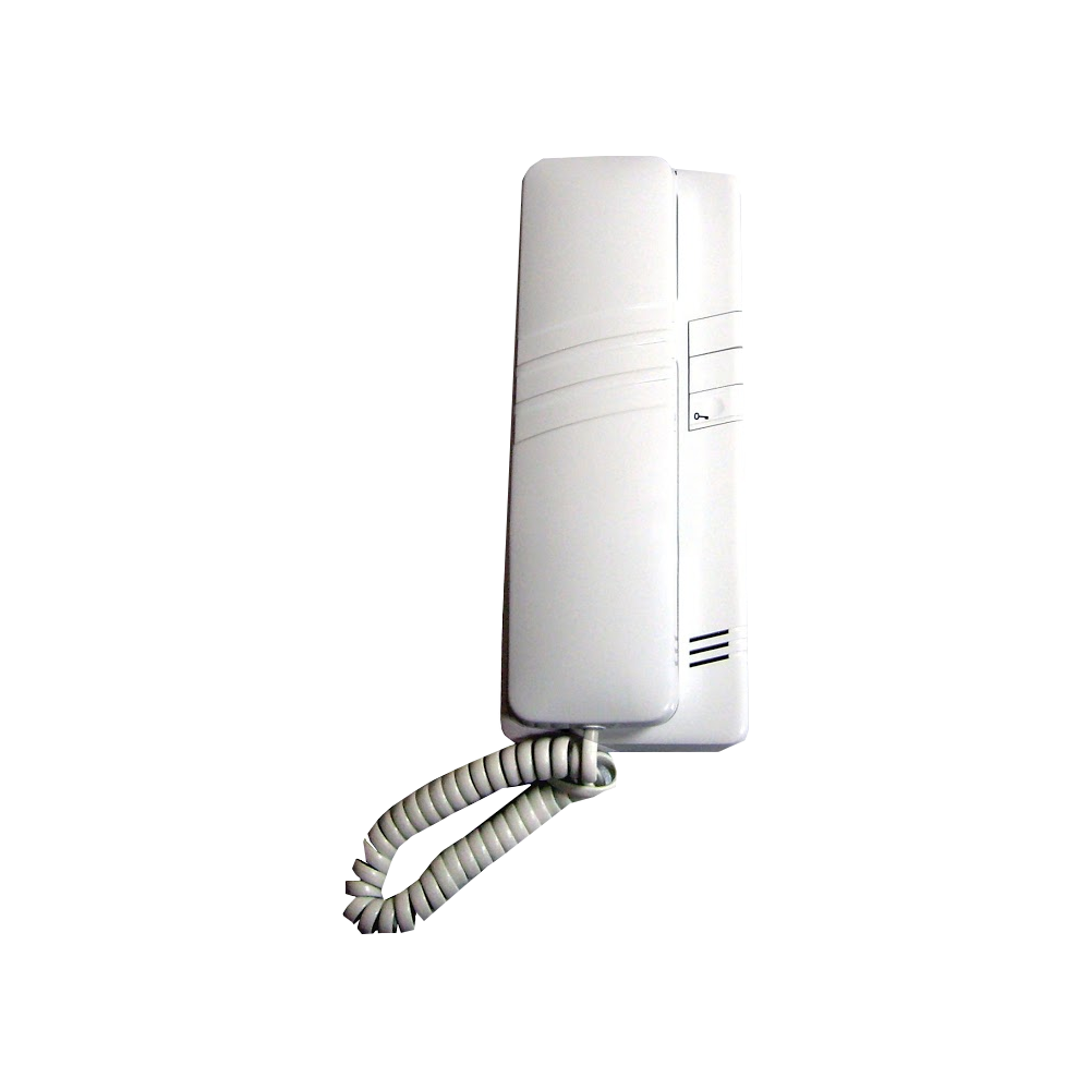 Tesla kaputelefon, 4FP 211.06.201 lakáskészülék. 1+n vezetékes lakáskészülék, kapunyitó gomb, széles MKT kaputelefon rendszerekhez. Használható a következő rendszerekhez: Codefon, DKT-Elektroportal, Fermax, Megafon, KATE és Tesla MKT rendszerű központhoz. Sorkapcsos bekötésű. Kapunyitó nyomógomb található rajta. Fehér, műanyag készülékház. Működési hőmérséklet tartomány: +5 °C - +40 °C.