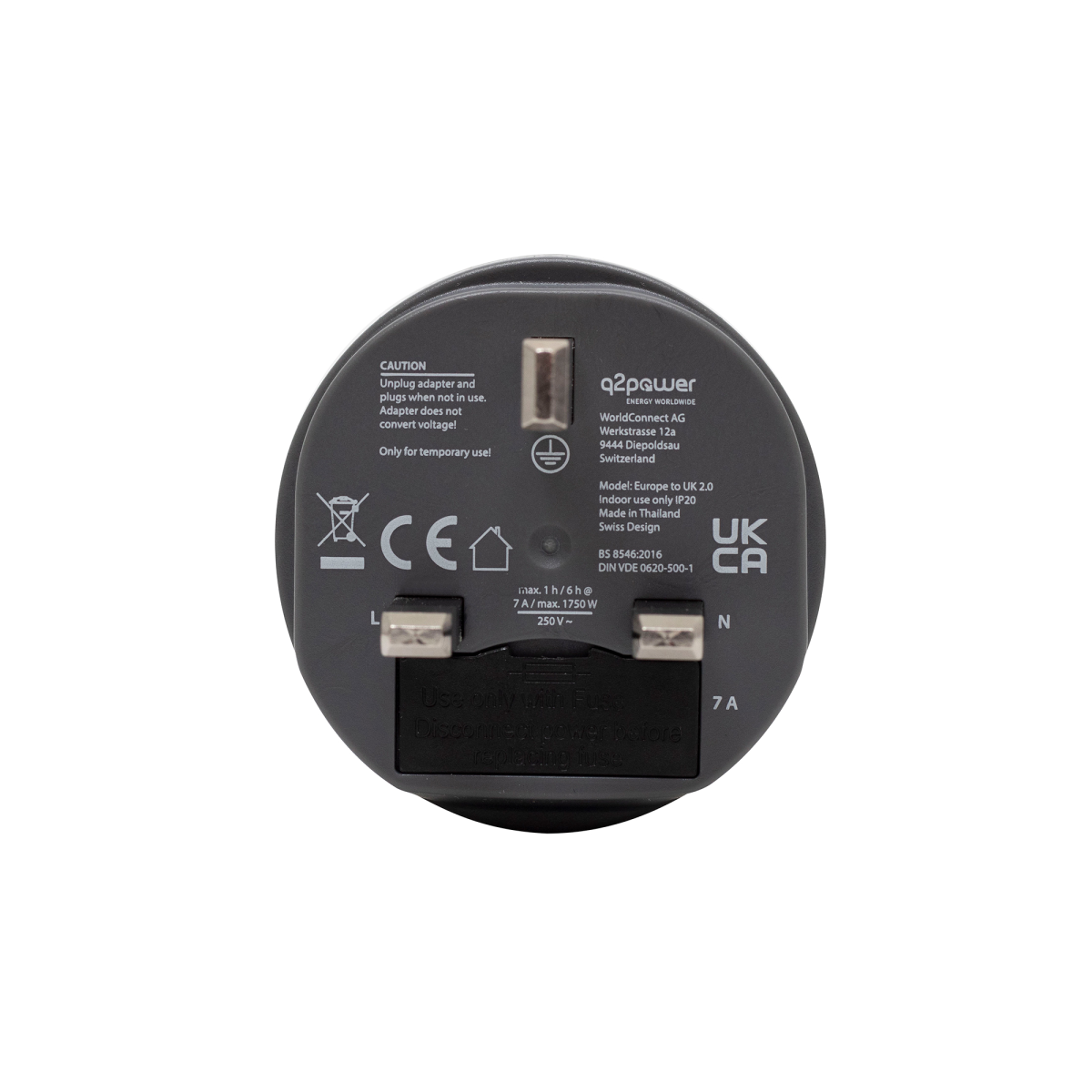 Alkalmas 2 pólusú és 3 pólusú (földeletlen és földelt) eszközökhöz (I. és II. osztály). Használható földelt GS csatlakozós készülékekhez. Indulás országának szabványa: GS. Célország csatlakozójának szabványa: UK. Bemeneti feszültség: 100-250 V. Max. terhelés: 7 A. Teljesítmény: 100 V - 700 W / 250 V - 1750 W.