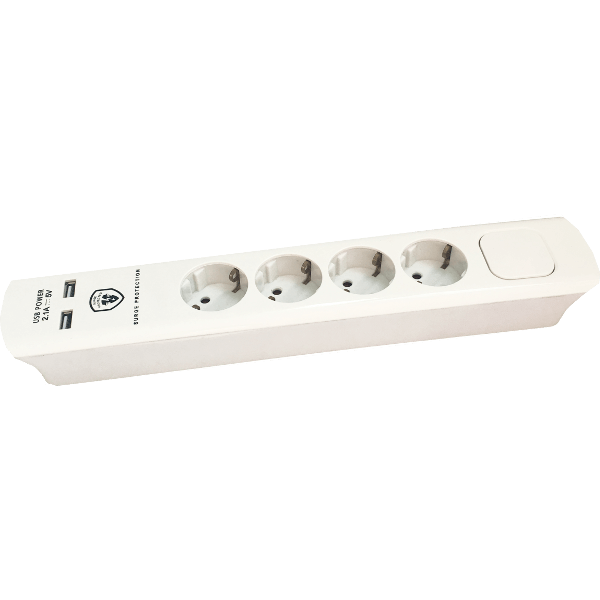 Elosztó 4-es kapcsolós, fehér. 1,4m2, USB csatlakozó, kábel: H05VV-F 3G1, 5mm216A/250Vß, max. 3680W.