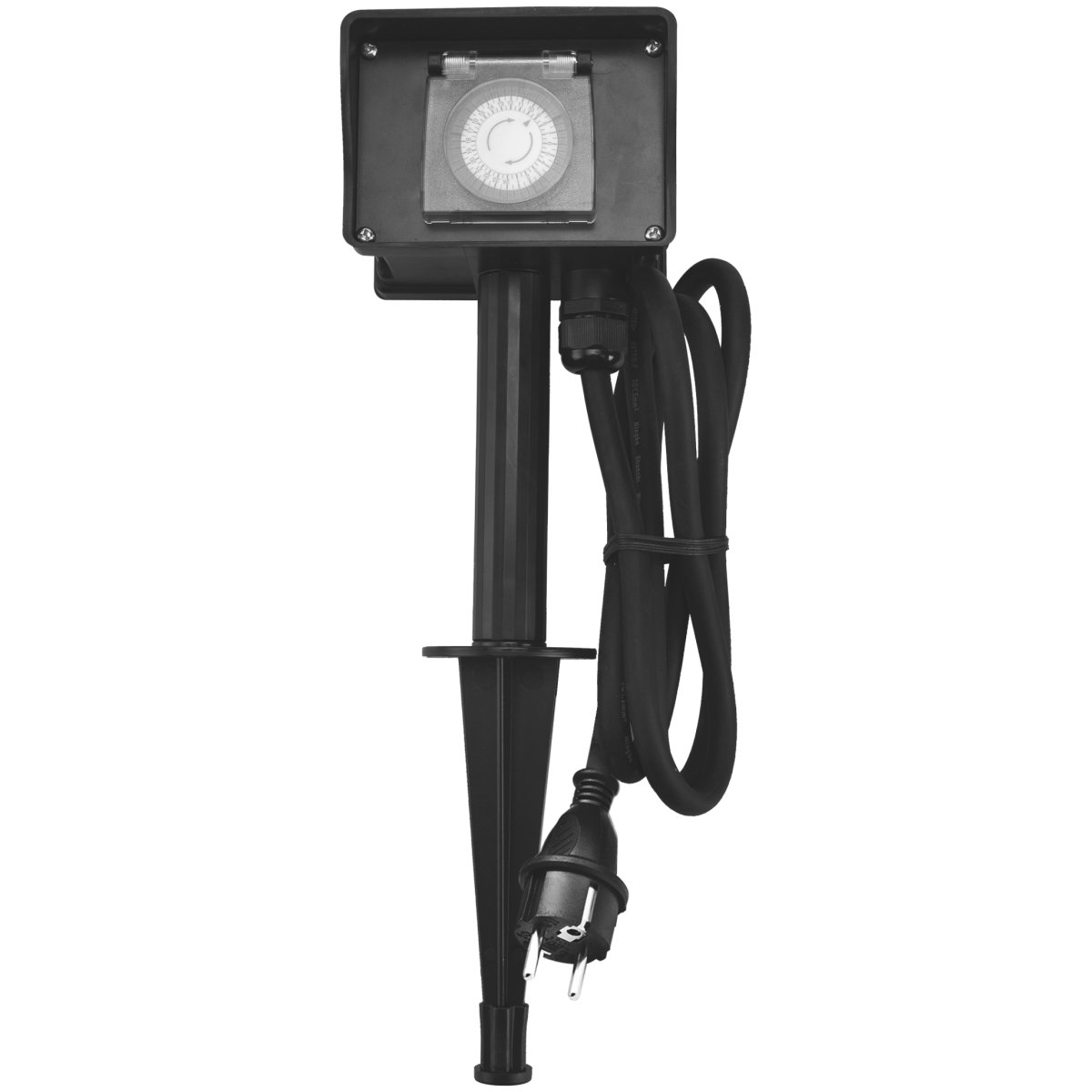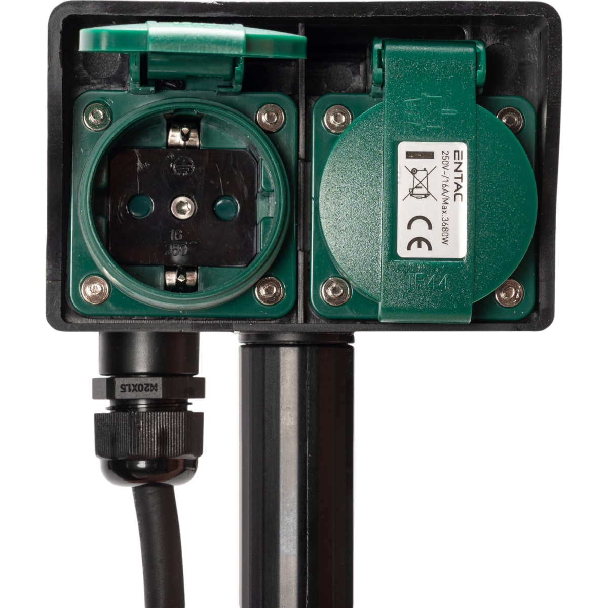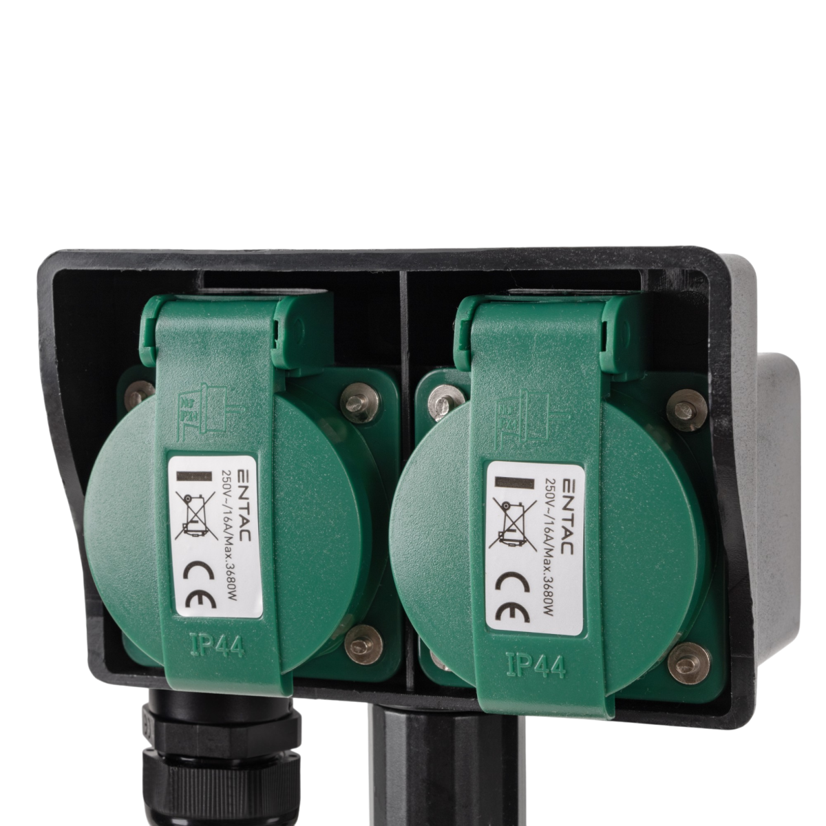 Entac IP44-es leszúrható kerti elosztó. Földelt foglalatos hosszabbító fekete színben, 1,5 méteres változatban, 3G1.5 kábeltípus, két foglalattal. Az IP44-es elosztók kültéri használatra is megfelelnek, por és vízálló tulajdonságuknak köszönhetően. Eszközök be-és kikapcsolása a beállított idő szerint. Időzítési tartomány: 24 óra. 30 Perces intervallumokban programozható. Maximum 48 be- és kikapcsolás naponta.