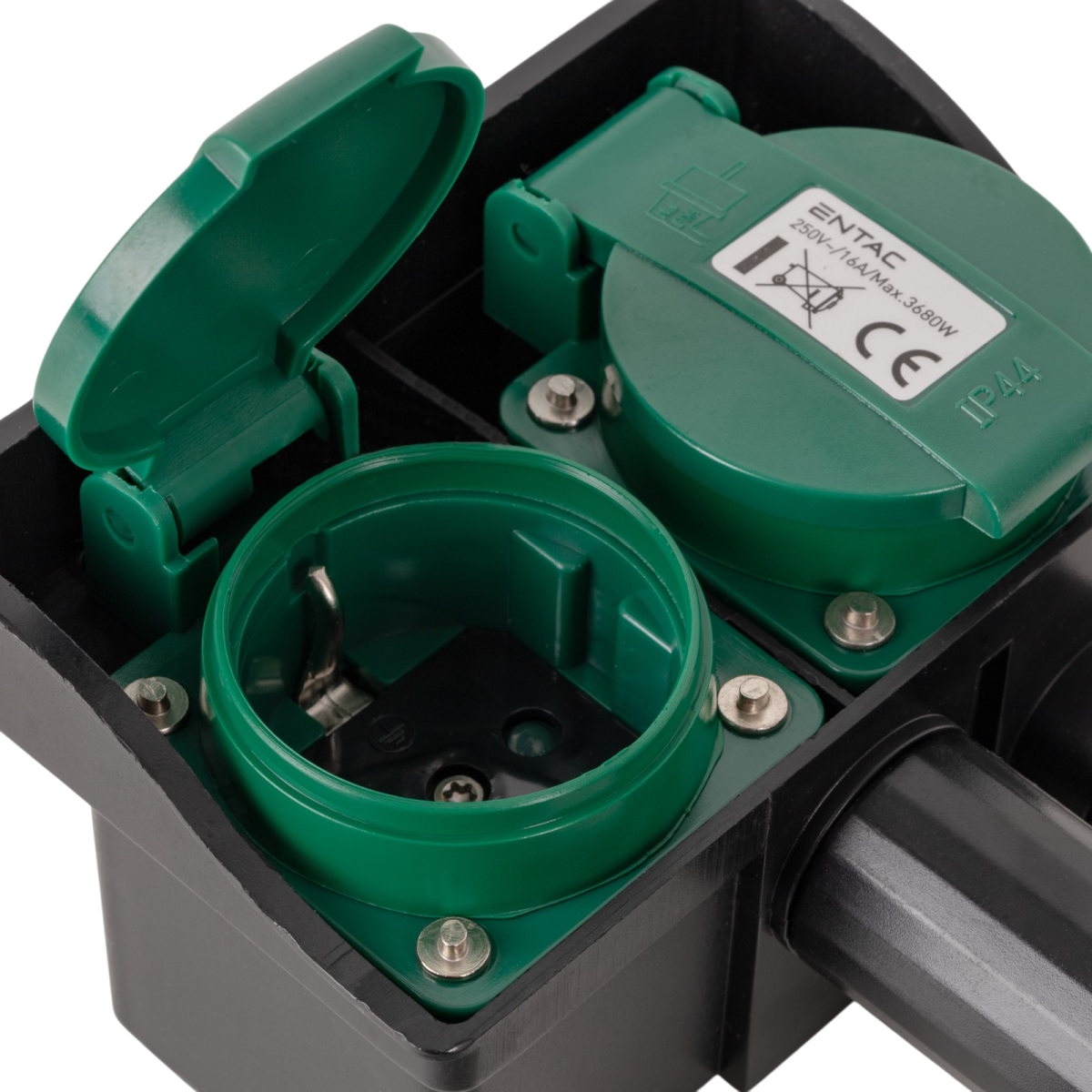 Az Entac IP44-es leszúrható kerti elosztók a munkahelyek és háztartások elengedhetetlen eszközei. Segítségükkel áramot biztosítható minden elektronikus eszköznek, még abban az esetben is, ha az áramforrás egy távolabbi helyen található. Az IP44-es elosztók kültéri használatra is megfelelnek, por és vízálló tulajdonságuknak köszönhetően.