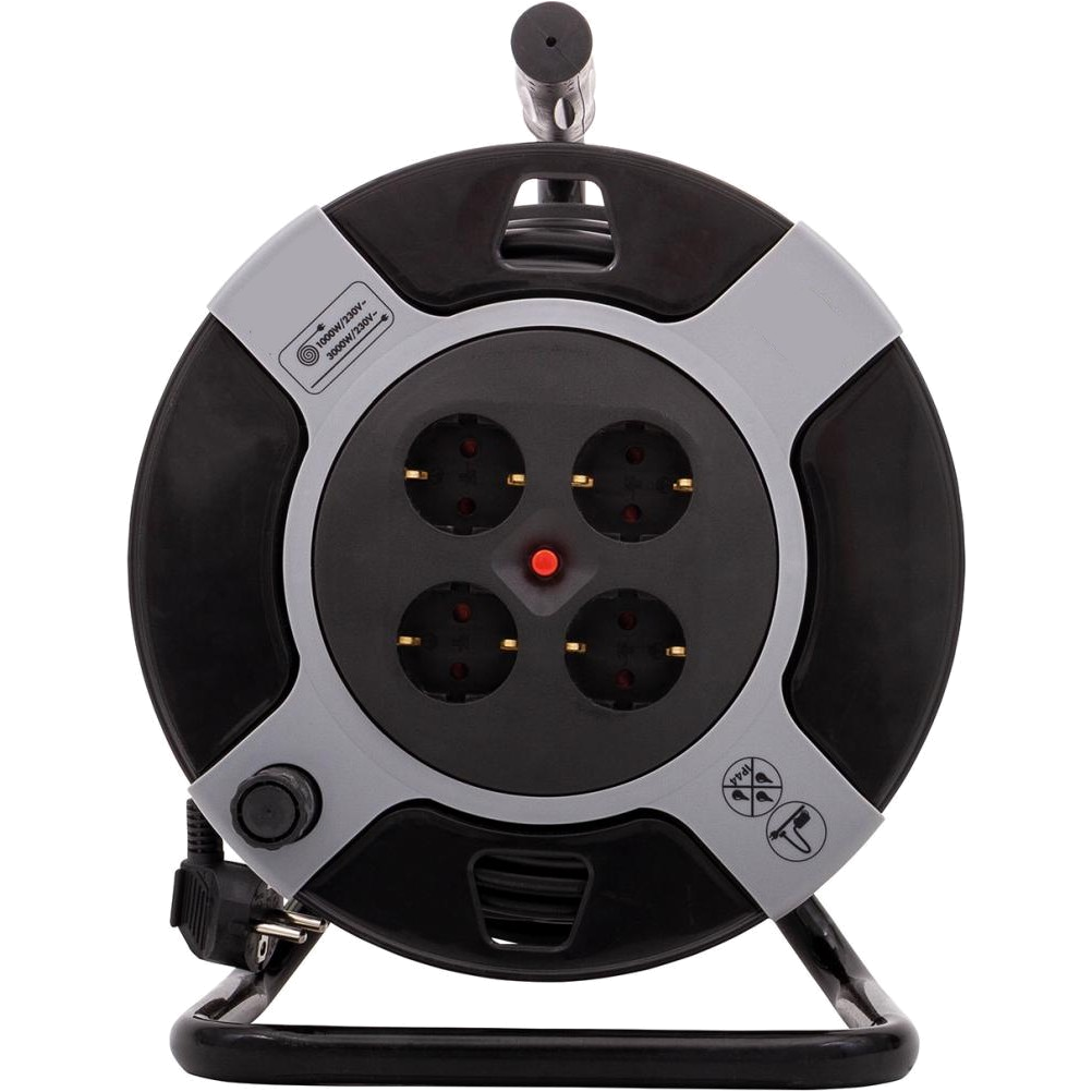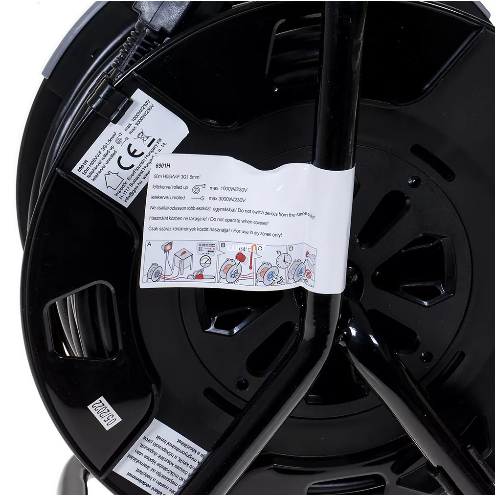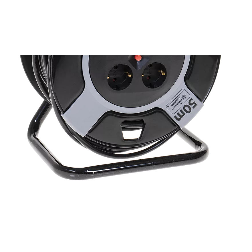 50 méteres kábeldob fém állvánnyal és műanyag csévetesttel, 4 dugaljjal. Túlmelegedés esetén a beépített termokapcsoló lekapcsolja a dugaljakat, ami a visszahűlés után tovább használható. 50 méter H05VV-F (PVC szigetelésű) 3x1.5 vezetékkel. Nem védett fröccsenő víz ellen, így csak ideiglenesen használható kültéren és száraz körülmények között.