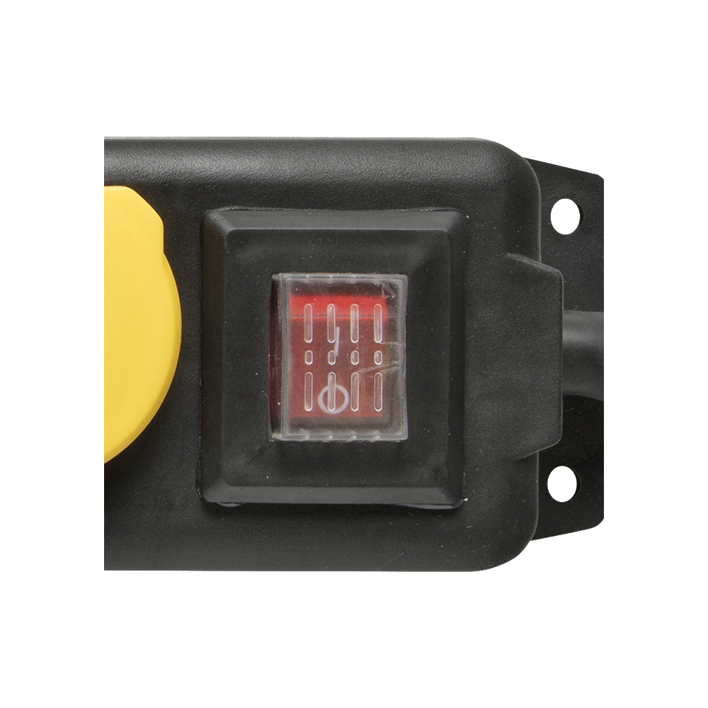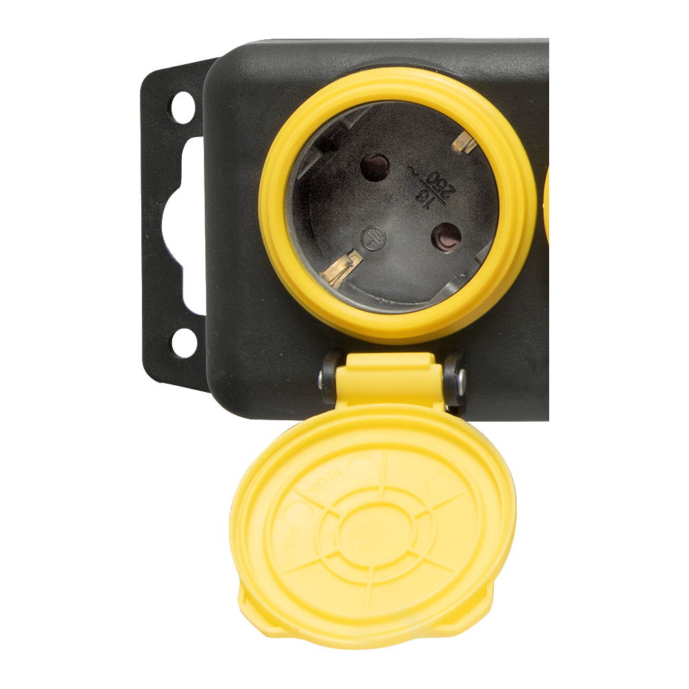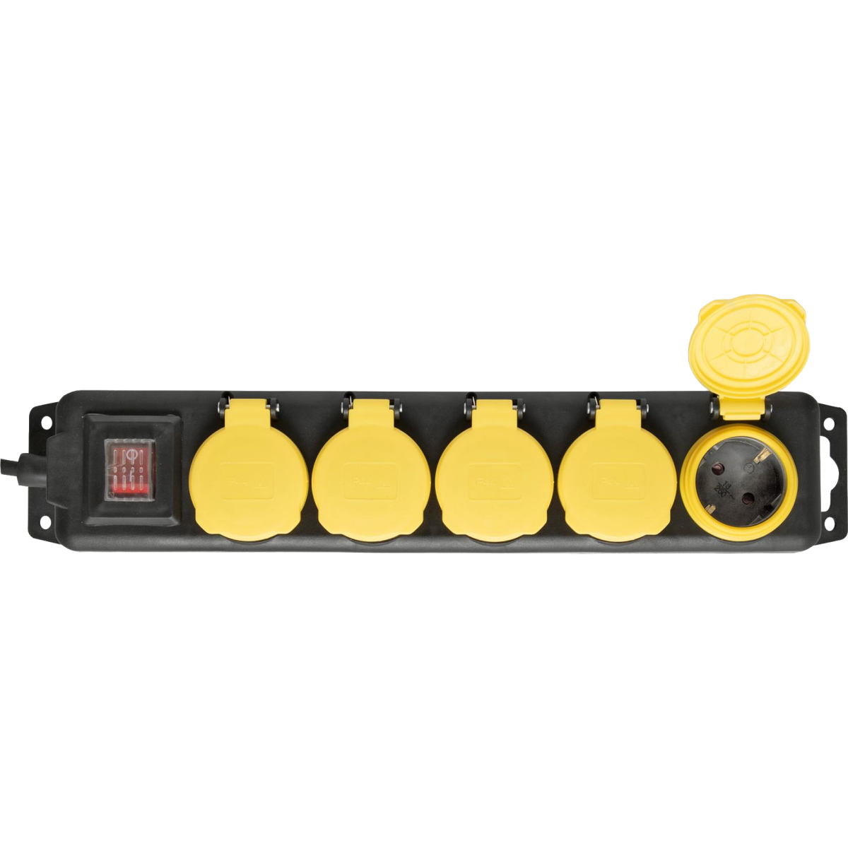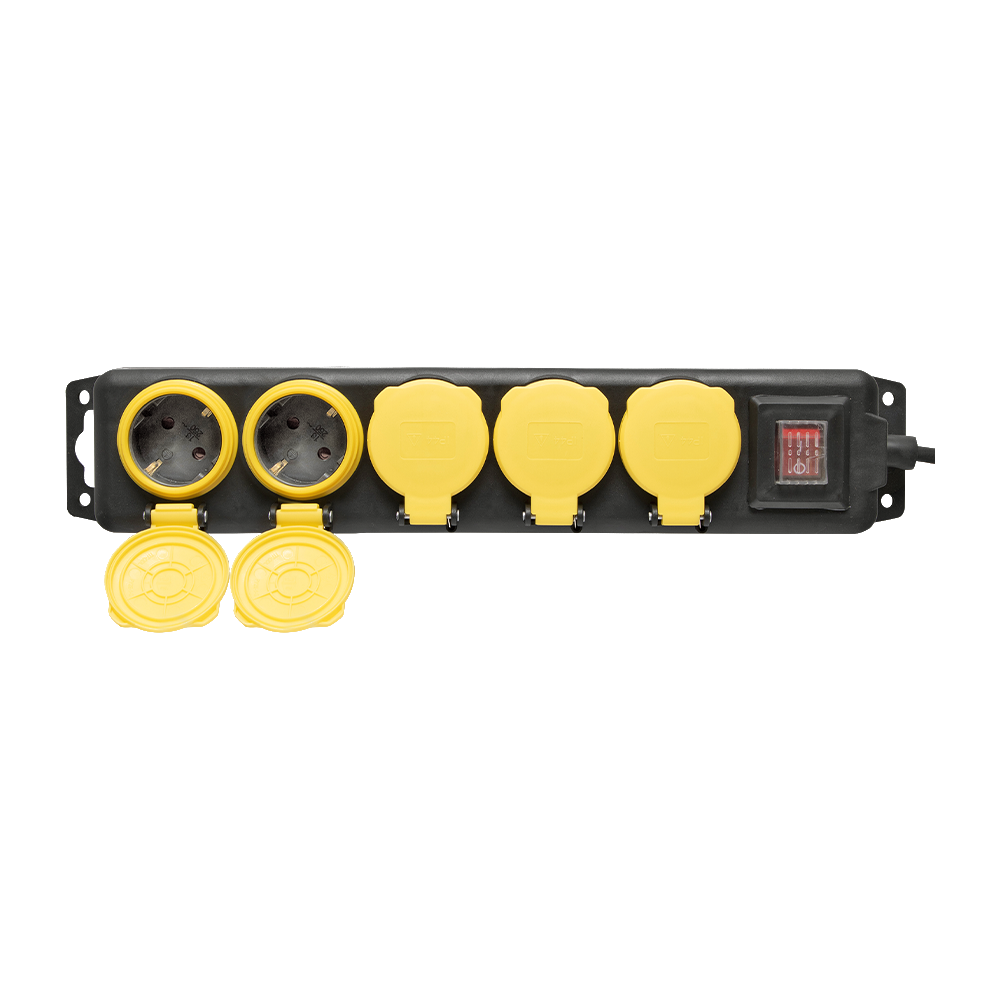 Hálózati elosztó kapcsolós, masszív, kültéri kivitelben készült 1,5 m hosszú H05RR-F 3G1,0 mm² fekete gumikábellel. A termék IP 44 védettségű, a zárófedeles aljzatok által kültéren is biztonsággal használható. Az elosztó 5 db gyerekvédelemmel ellátott, 250 V-os aljzattal felszerelt. Maximum 3500 W-ig terhelhető.