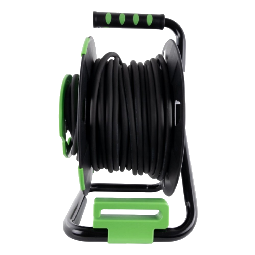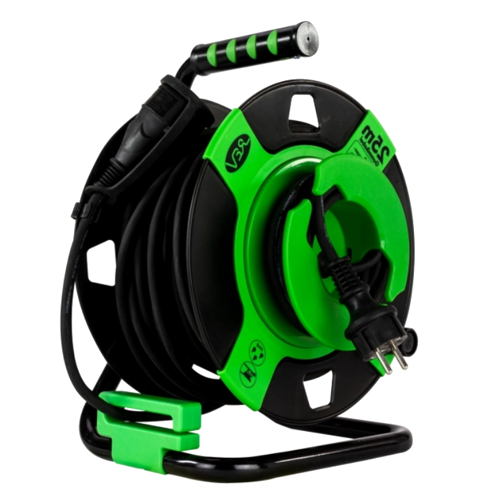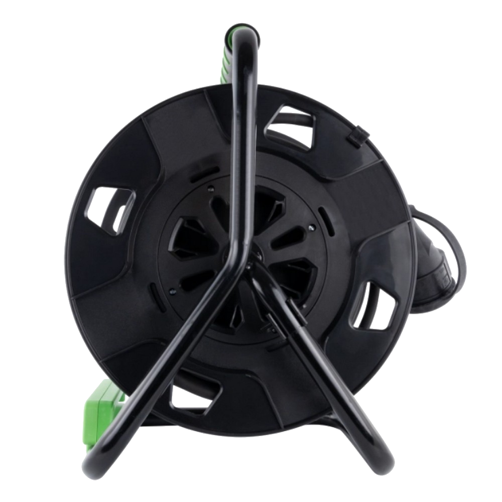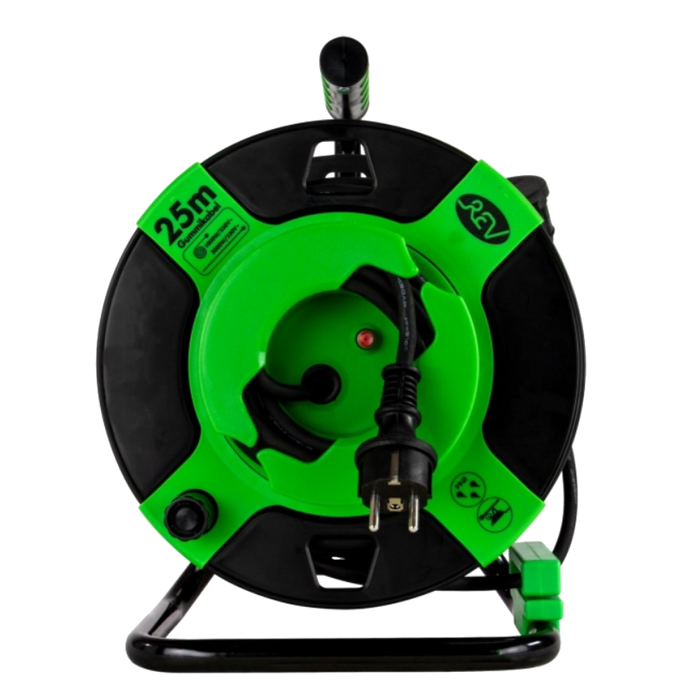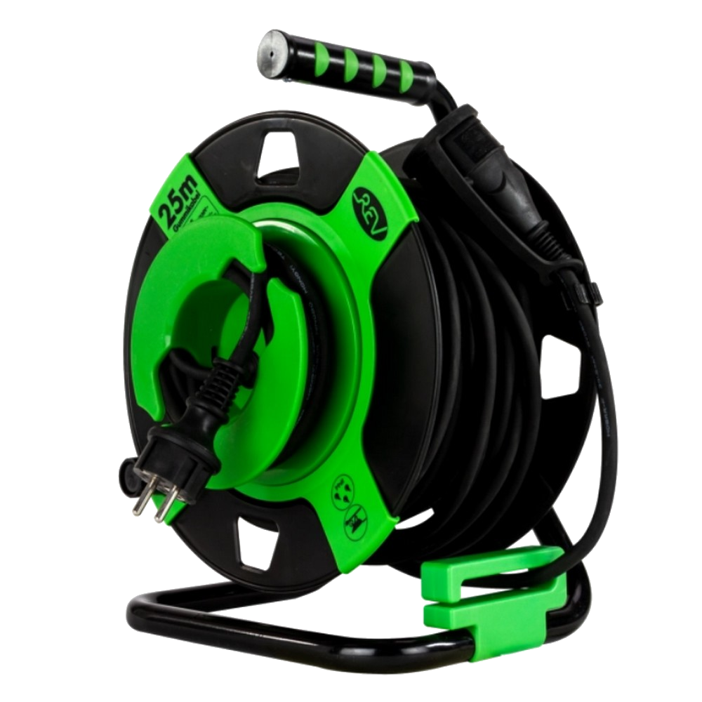 25 méteres kábeldob egy lengőaljzattal, műanyag, termo kapcsolóval, fekete, zöld színben. Tartós kültéri használatra alkalmas. H05RR-F 3x1.5mm2, 250V, 16A, IP44.