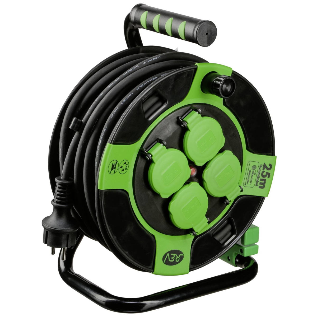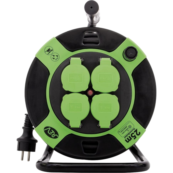 Kábeldob 25 méter kábellel és 4 db csapfedeles dugaljjal a rugalmas és biztonságos áramelosztáshoz a házban és a ház körül.