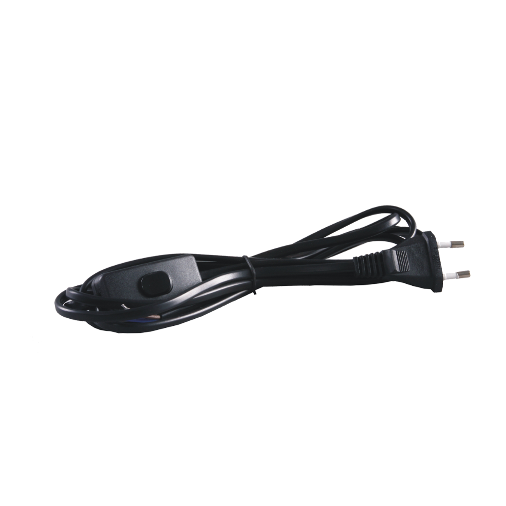 Lapos kettős szigetelt PVC kábel egyik végén földeletlen euro csatlakozóval ellátva. Egypólusú kapcsolóval szerelve. Max. 2,5A áramfelvételű készülékek csatlakoztatásához. Fekete színű. Teljes hossz: 250 mm, Kapcsoló-dugvilla távolság 110 mm.