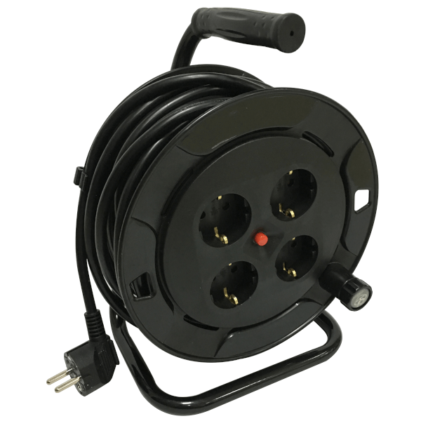 4 férőhelyes kábeldob 25 méter kábellel, fekete színben, túlmelegedés elleni védelemmel, IP44. Kábel: H07RN-F 3G1,5mm².