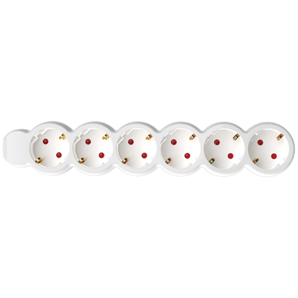 Fehér színű hálózati elosztó, 6db aljzattal és 1,5m hosszú H05VV-F 3G1,0 mm2 kábellel felszerelt. A biztonságos használat érdekében gyermekvédelemmel ellátva. Maximum 3500W-ig terhelhető.
