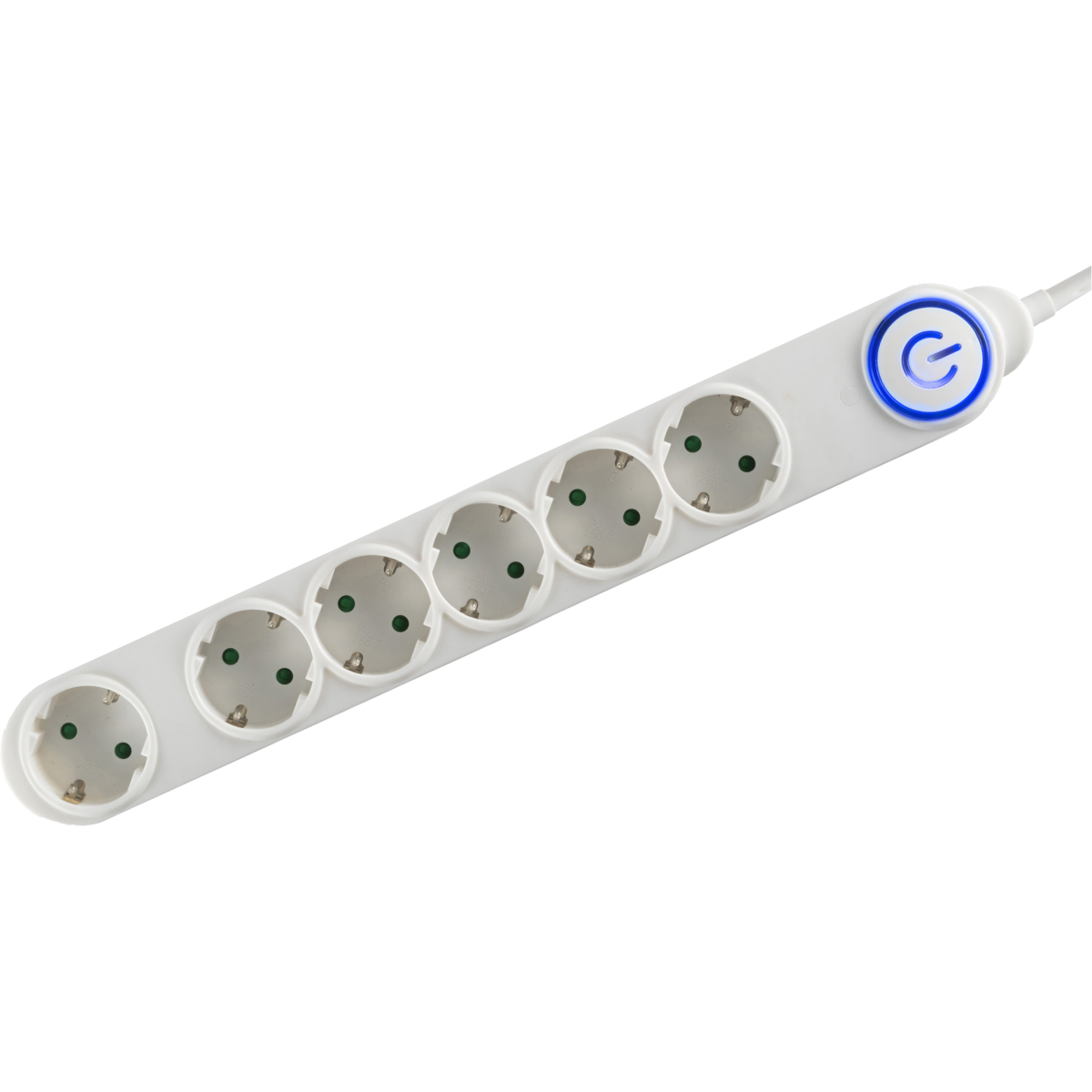 Talpkapcsolós elosztó, világító kapcsolóval van ellátva. A hat aljzathoz 1,5 méteres kábel tartozik. A termék előnye, hogy a hatodik aljzat külön található, hogy kényelmesen elférjen pl. egy adapter. Gyermekvédelemmel ellátott, fehér színű.