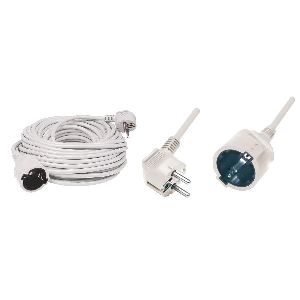 Hálózati hosszabbító, pipa alakú dugó és egyenes lengő aljzat H05VV-F 3G1,0 mm2 kábel, IP20 kivitel, 20 m-es fehér színben.