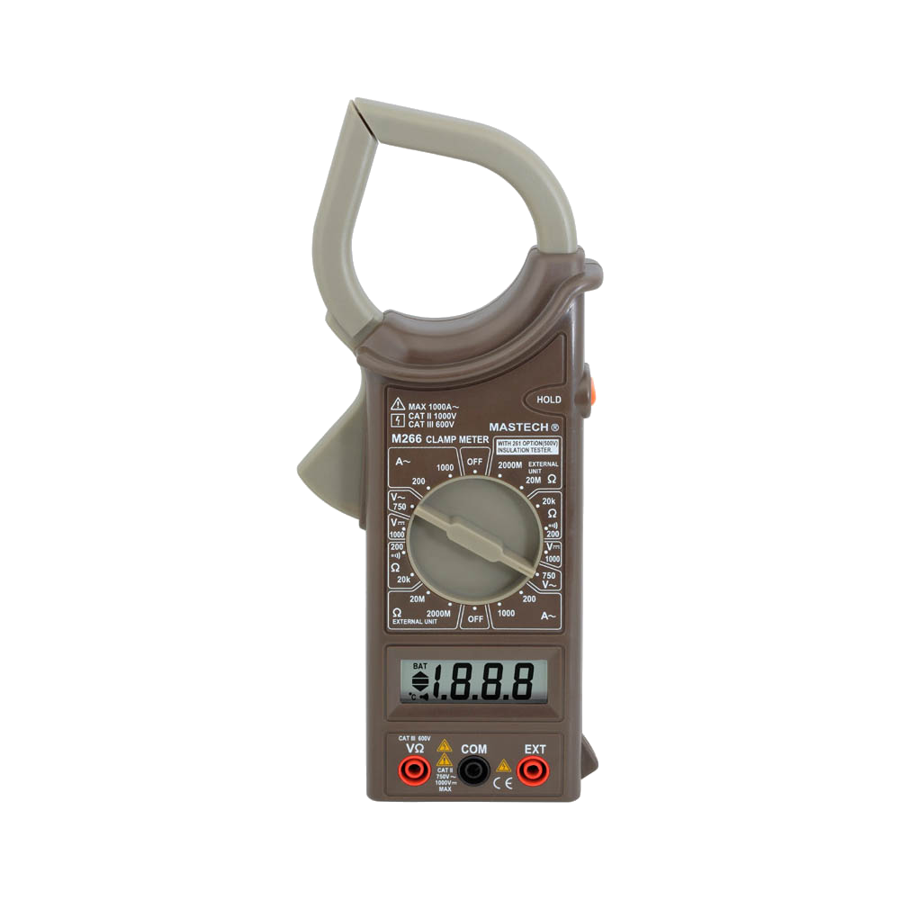 DIGITÁLIS LAKATFOGÓ M 266 - nagyáramú mérésekre, - 6 cm-re szétnyíló gyűrűvel - szigetelésvizsgáló adapter csatlakoztatható hozzá - tápellátás: 1 x 6LR61 (9 V) elem (tartozék) - tartozék: cipzáras bőrtok