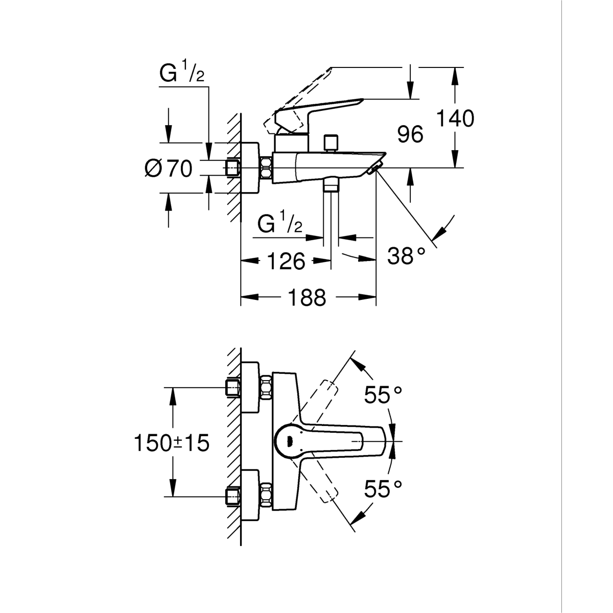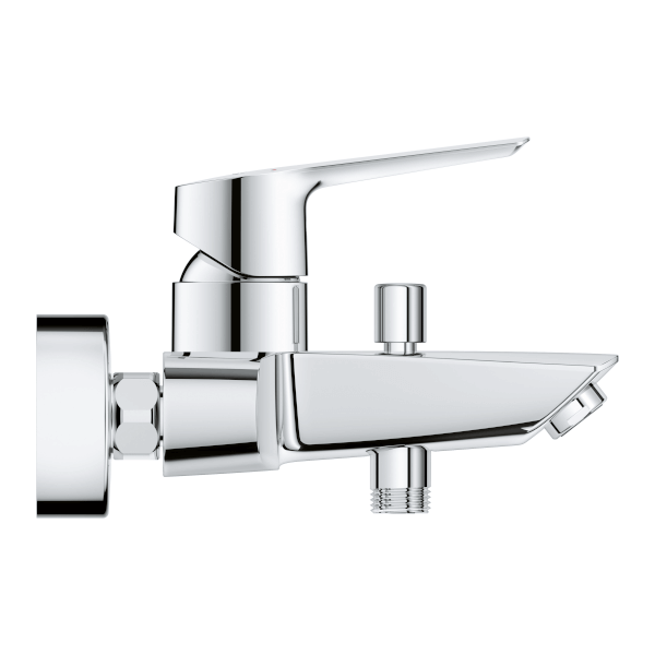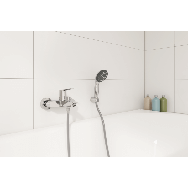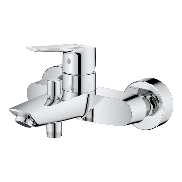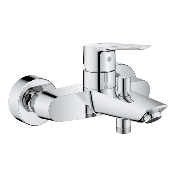 Grohe Start kád csaptelep fali kivitel; fém fogantyú; GROHE SilkMove 35 mm-es kerámiabetét; állítható mennyiségkorlátozó; beépített hőmérséklet-korlátozó; GROHE StarLight króm felület; automatikus váltószelep: kád/zuhany; gyöngyöztető; beépített visszafolyásgátló a 1/2"-os zuhanykimenetben; S-csatlakozók; fém fali rozetta; belépő-oldali visszafolyásgátlóval. Zuhany szett nélkül értékesítjük.