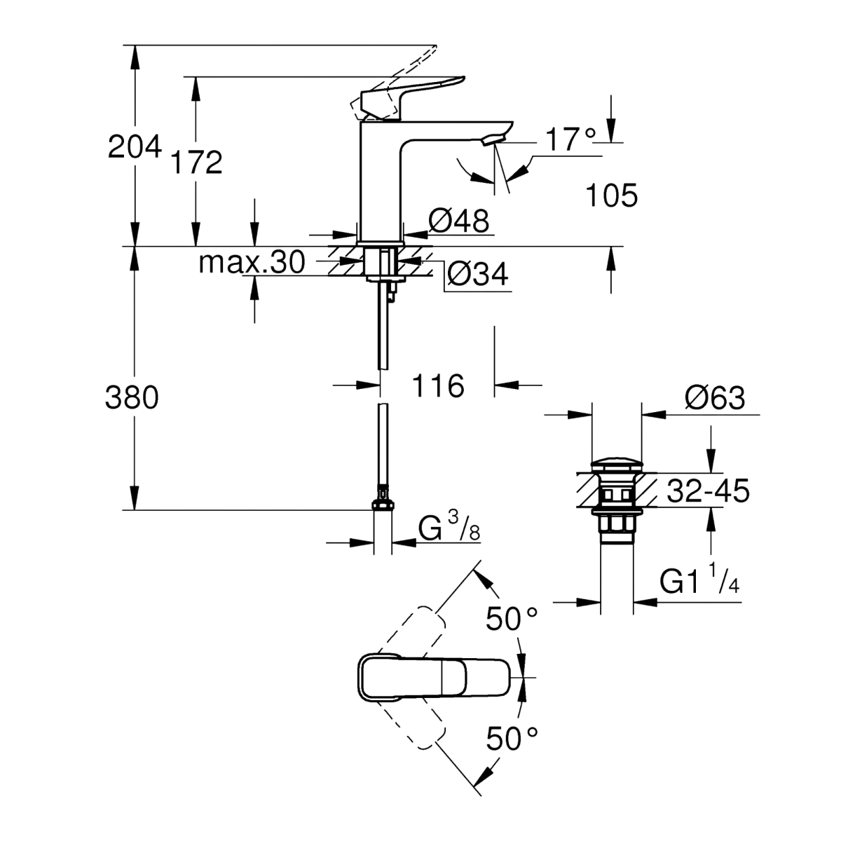 Az egylyukas kivitel és a GROHE FastFixation rendszer egyszerű telepítést biztosít. A csomagban található a Grohe QuickTool szerelési segédeszköz, a klikk-klakkos leeresztőgarnitúra és a flexibilis csatlakozótömlők, így a beépítéshez minden szükséges elem rendelkezésre áll.