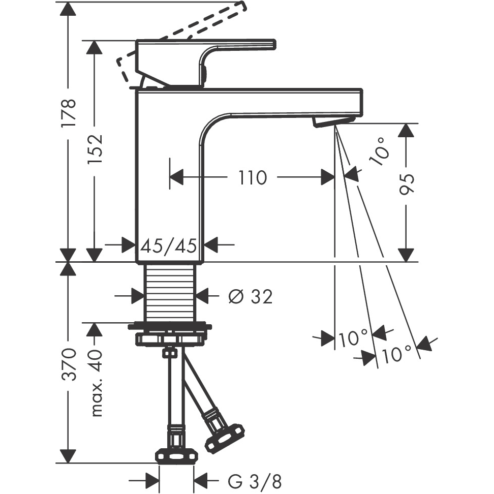 Termékjellemzők: ComfortZone 100, kinyúlás: 110 mm, kifolyó magassága: 95 mm, vízsugár fajta: normál vízsugár, maximális átfolyási mennyiség 3 bar mellett: 5 l/perc, kerámiabetét,