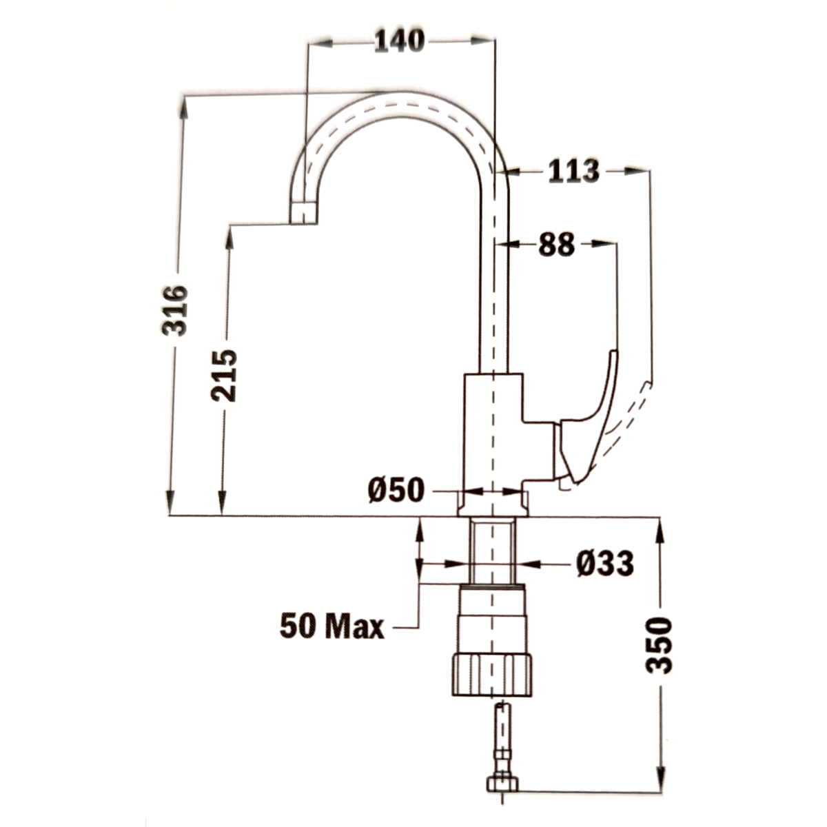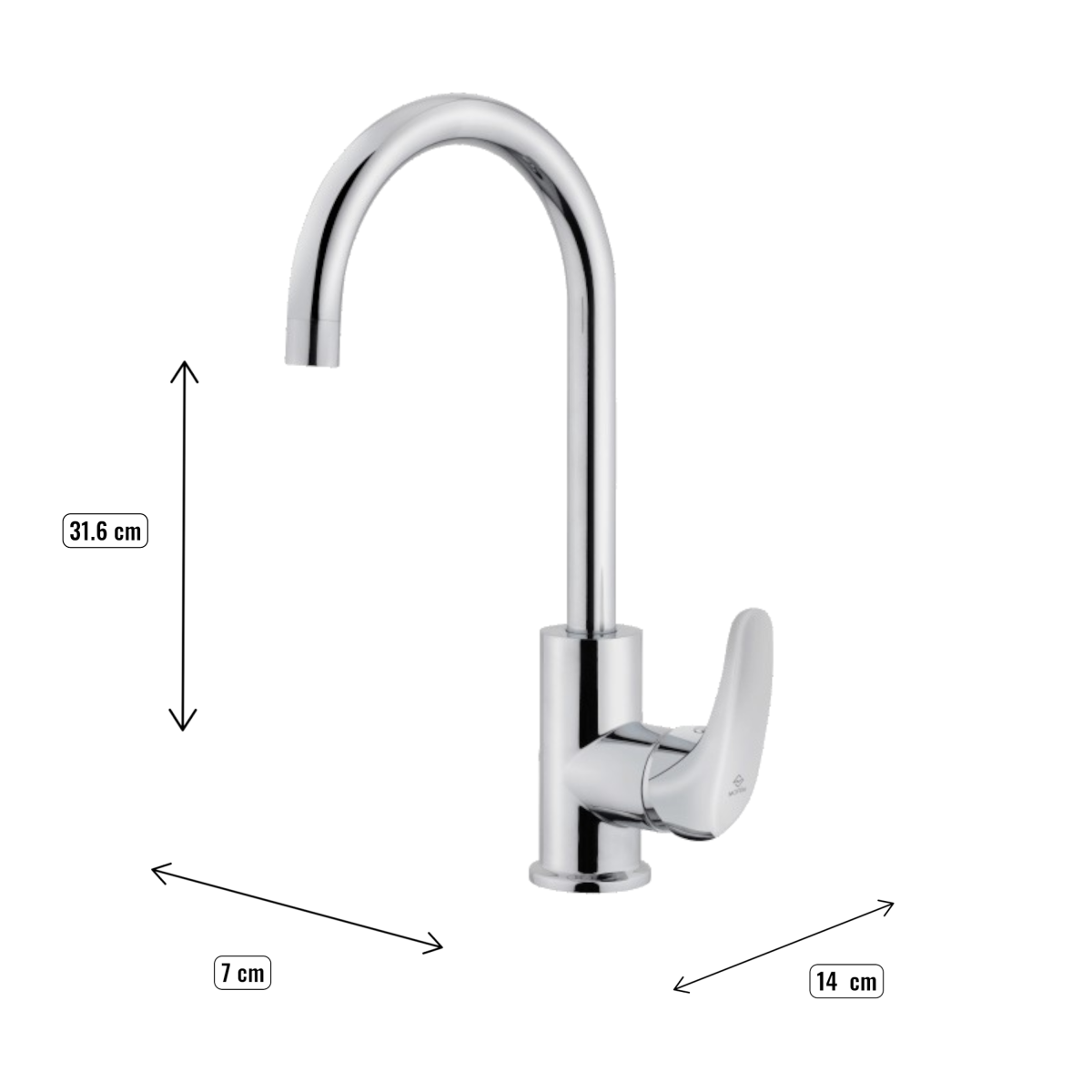 Kompakt, modern megoldás pulton álló mosdókhoz: 316 mm összmagasság, 140 mm kifolyó-benyúlás, krómozott felület. Leeresztőszelep nélkül szállítva, flexibilis bekötőcsővel és szabványos 1/2" csatlakozással – gyors telepítésre optimalizálva.