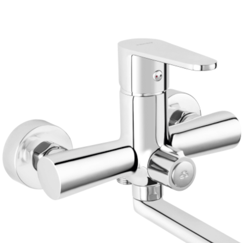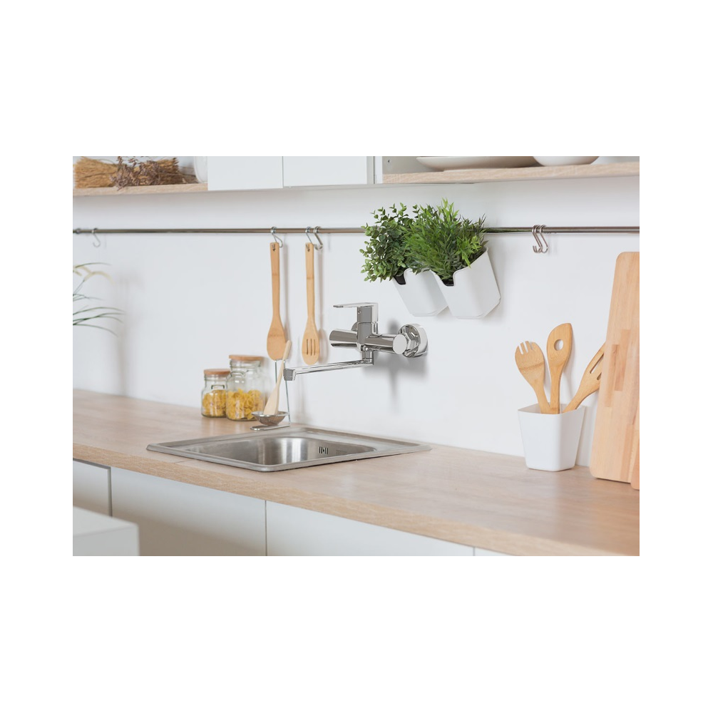 Algeo fali, króm mosogató csaptelep elforgatható kifolyóval, hossza: 220 mm, perlátor M24x1, Z-idom G1/2, kiállások közötti távolság 150 ± 20 mm, króm színben.