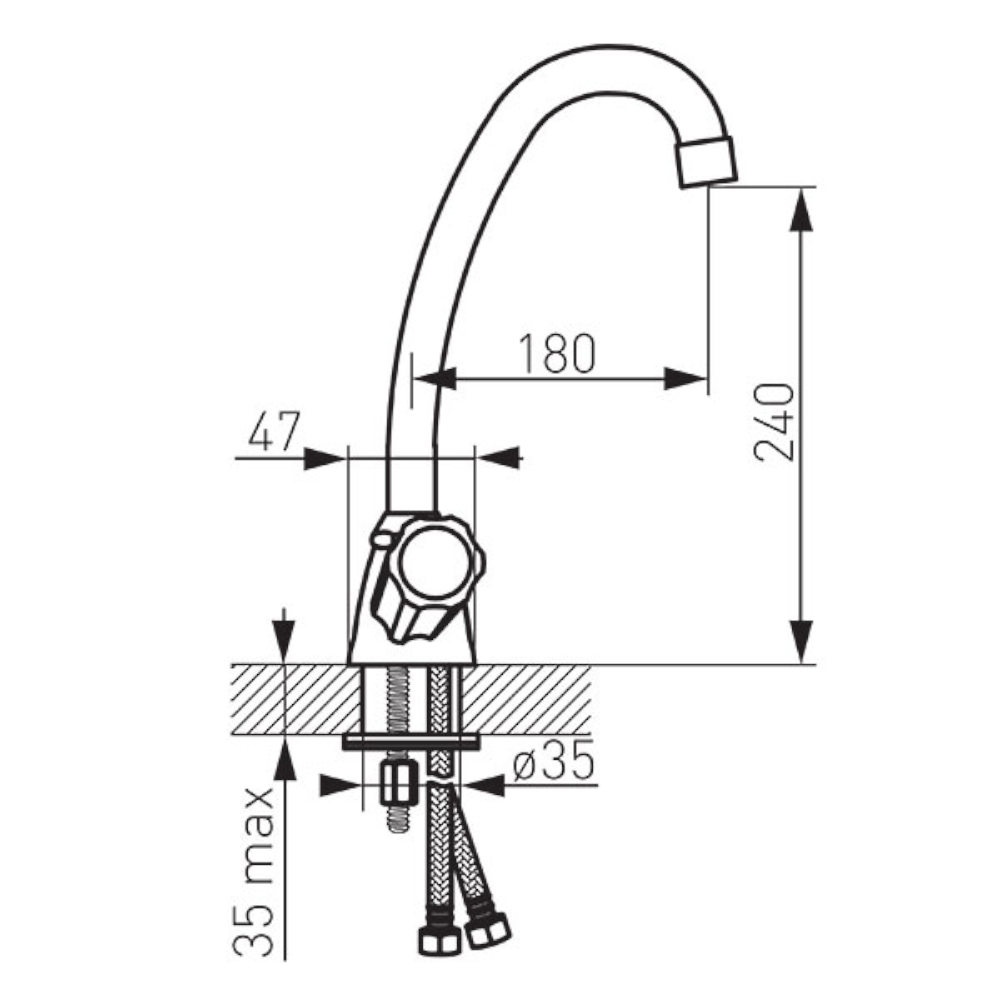 A Ferro Standard két gombos álló mosogató csaptelep hagyományos megjelenésű, kétkaros kialakítással készült, amely egyszerű és jól bevált megoldást kínál a konyhai vízhasználathoz. Az elforgatható, 190 mm hosszú kifolyócső rugalmasságot ad a használat során, a M22x1 perlátor pedig segíti a vízáramlás szabályozását. A G3/8-M10x1 csatlakozású flexibilis bekötőcsővel a telepítés gyors és egyszerű. Krómozott felülete jól illeszkedik a legtöbb konyhai környezethez.