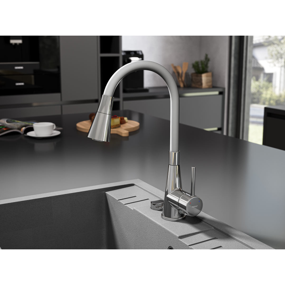 A Ferro Zumba II mosogató csaptelep elegáns kivitelével és ezüst színű, formálható, flexibilis csövével tökéletes választás a praktikus és stílusos konyhákba. A kétfunkciós zuhanyfejnek köszönhetően válthatsz a normál és a zuhanysugár között, a kifolyócső alakja és magassága pedig igény szerint állítható (18–38 cm mélység, 29–44 cm magasság). A kerámiabetét megbízható működést nyújt, a G3/8-M10x1 flexibilis bekötőcső pedig megkönnyíti a telepítést.