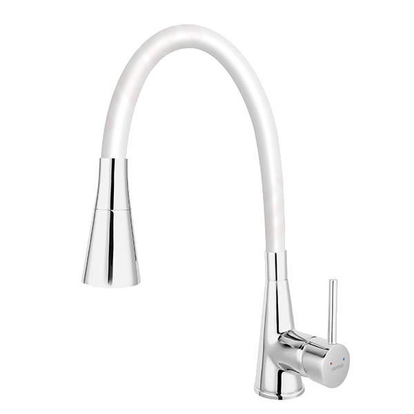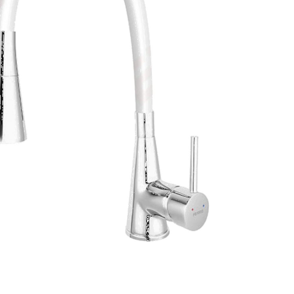 A Ferro Zumba II zuhanyfejes fehér flexibilis kifolyócsövű álló mosogató csaptelep a népszerű flexibilis verzió továbbfejlesztett változata. Megtartja az állítható, könnyen irányítható kifolyócső minden előnyét, és kiegészül egy praktikus zuhanyfejjel, amely kétféle vízfolyást tesz lehetővé: klasszikus („stream”) és zuhany („spray”) mód. Rugalmasan változtatható kifolyócső 18-38cm-ig, illetve a változtatható kifolyómagasság 29-44cm között lehetséges. Egyéb jellemzők: M24x1 perlátorral, G3/8-M10x1 flexibilis bekötőcsővel.