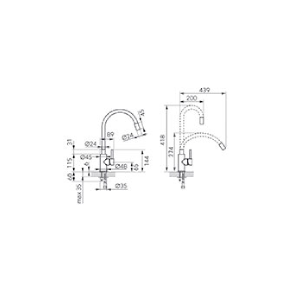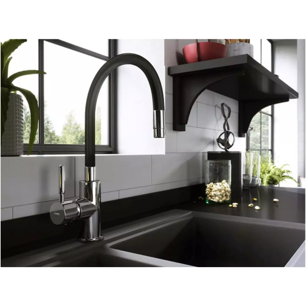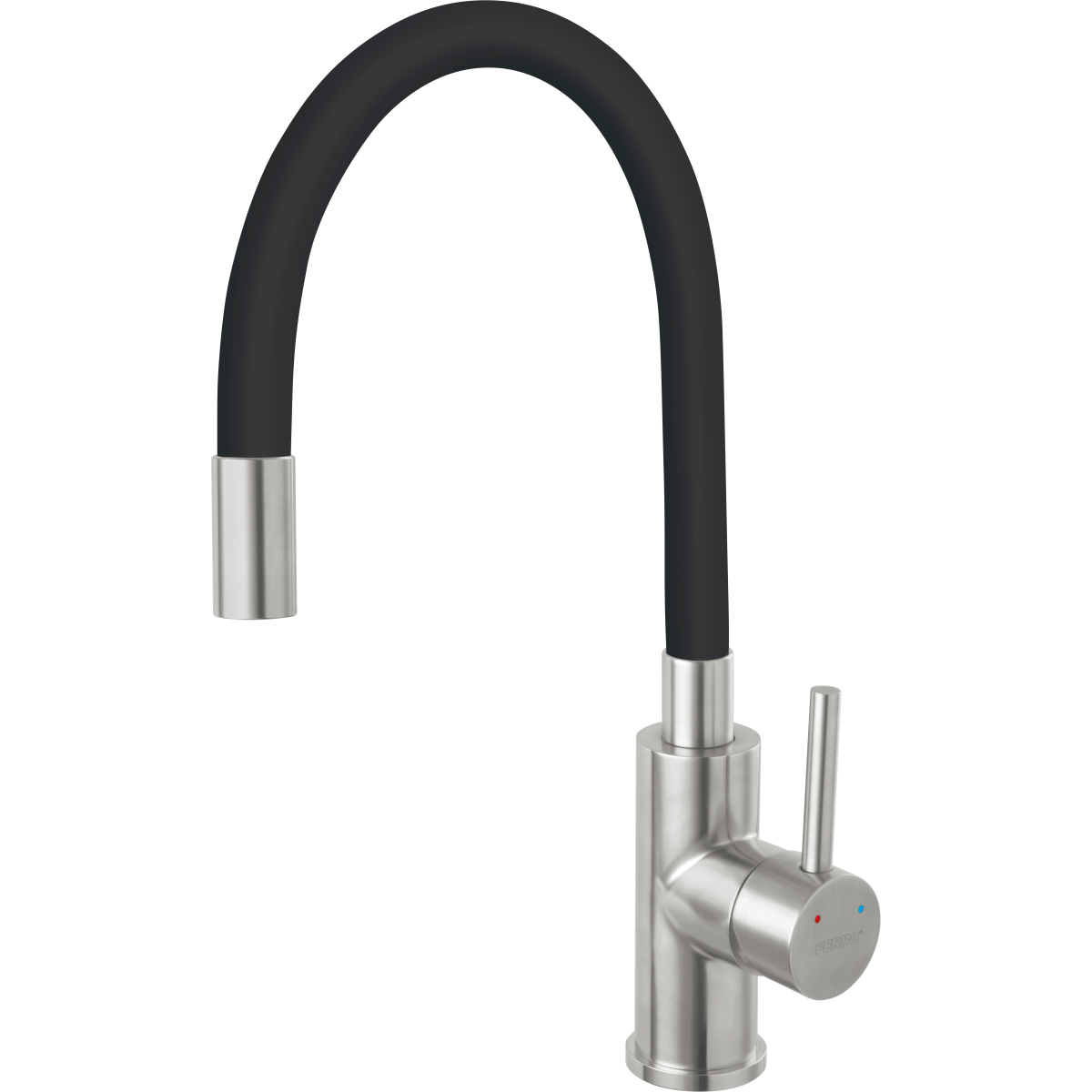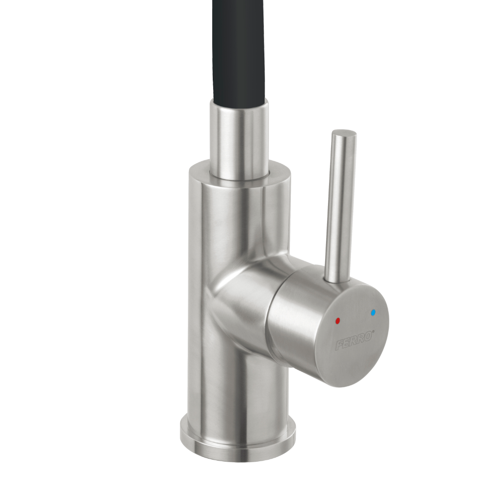 A Ferro Zumba Inox mosogató csaptelep rozsdamentes acél testtel és fekete színű, szabadon hajlítható kifolyócsővel modern és funkcionális megoldást kínál a konyhába. A cső magassága 27,4–41,8 cm, hossza 20–43,9 cm között állítható, így igazodik a különböző felhasználási igényekhez. A kerámia szabályozó betét egyenletes vízáramlást biztosít, míg az M22x1 perlátor csökkenti a víz fröccsenését.