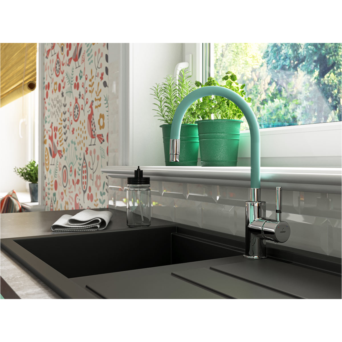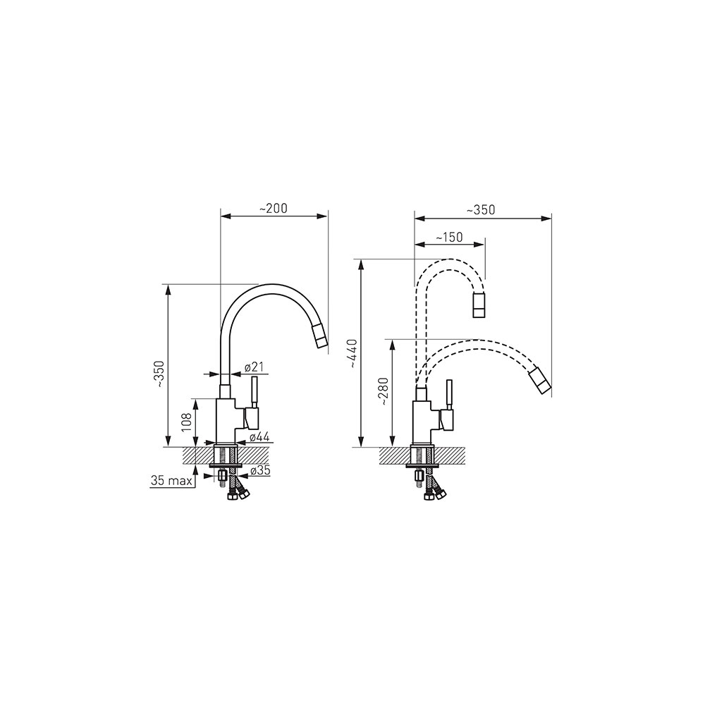 Rugalmas kifolyócső, amelynek alakja rugalmasan változtatható, mélység: 150 mm-től 350 mm-ig, magasság: 280 mm-től 440 mm-ig, perlátorral (M22x1), flexibilis bekötőcsővel (G3/8-M10x1), króm színű test.
