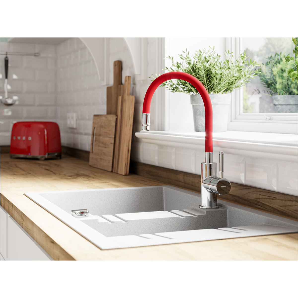 Rugalmas kifolyócső, amelynek alakja rugalmasan változtatható, mélység: 150 mm-től 350 mm-ig, magasság: 280 mm-től 440 mm-ig, perlátorral (M22x1), flexibilis bekötőcsővel (G3/8-M10x1), króm színű test.