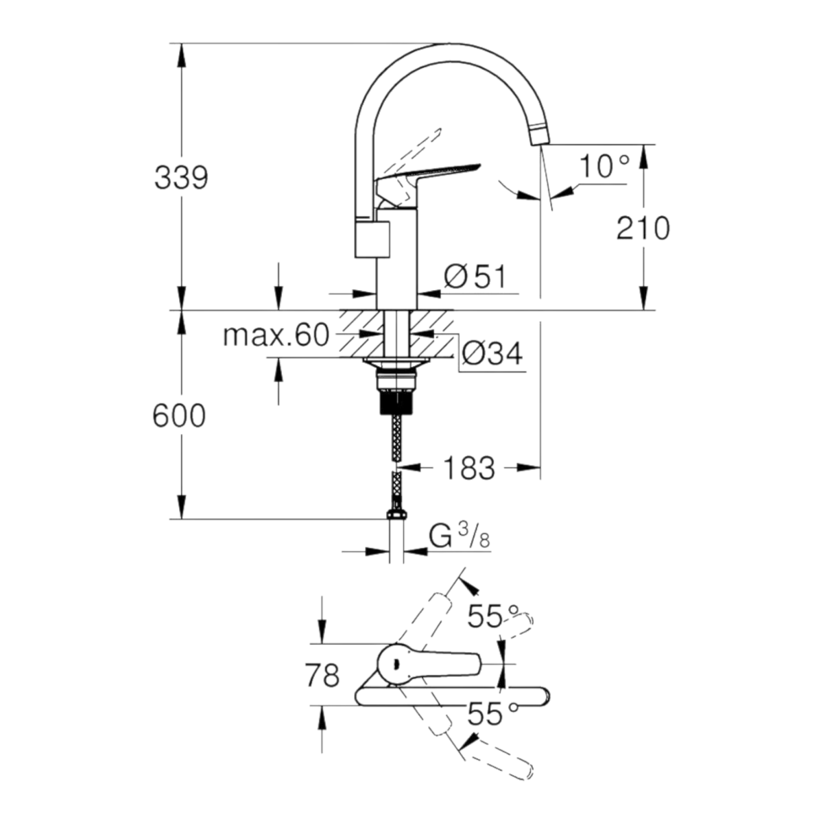 A Grohe QuickMount gyorsszerelő rendszer megkönnyíti a telepítést, a flexibilis 3/8"-os csatlakozótömlők pedig kompatibilisek a legtöbb háztartási kiállással.
