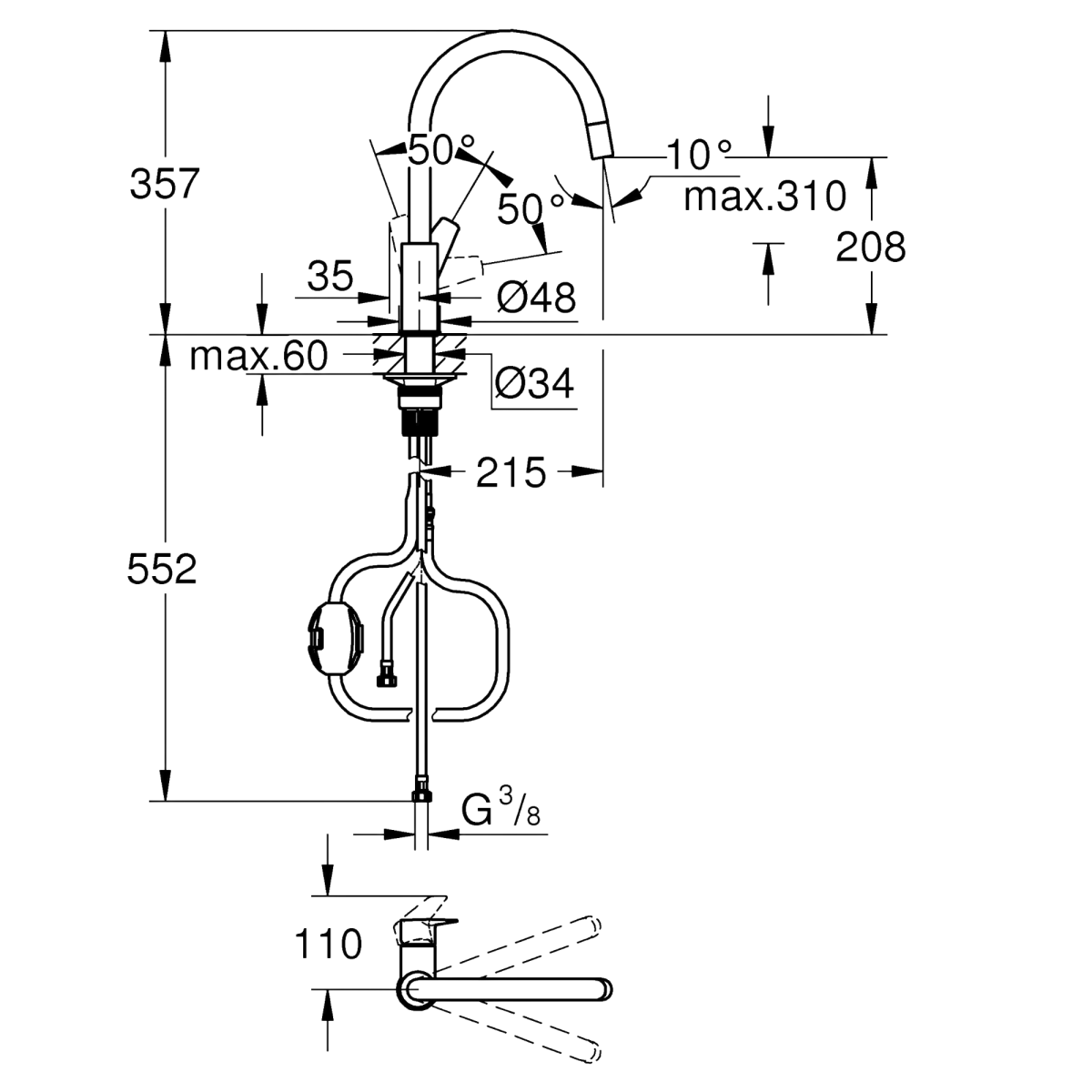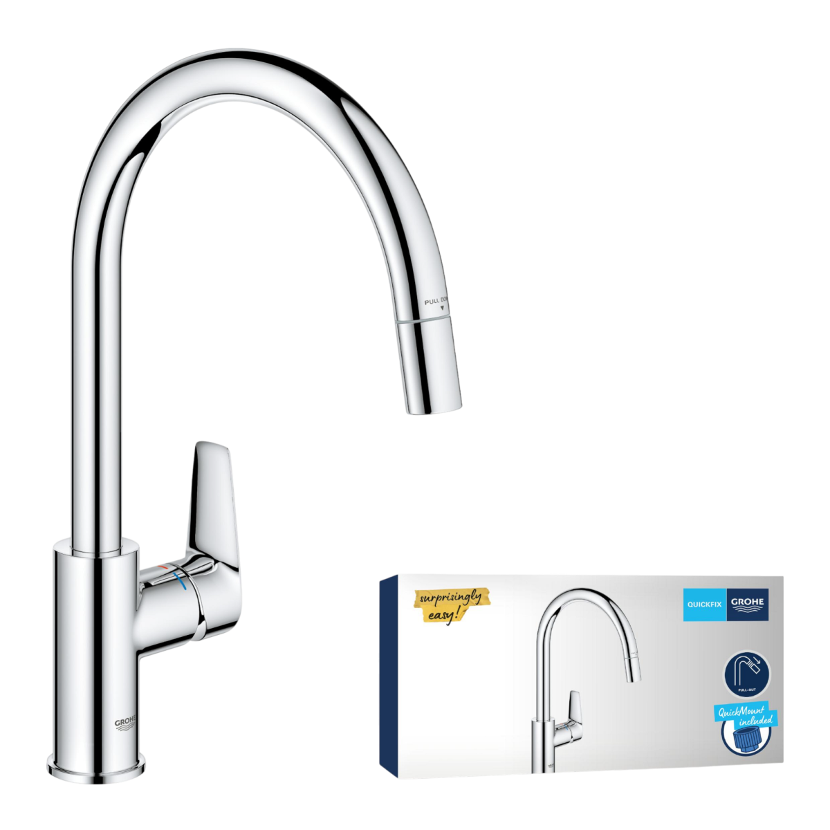 Az egylyukas kivitel és a GROHE QuickMount 2.0 rendszer egyszerű, gyors beépítést biztosít. A flexibilis csatlakozótömlők 3/8"-os méretben mellékelve vannak, így a telepítéshez csupán alapvető szerszámokra van szükség. Szakszerelő bevonása javasolt a biztonságos üzembe helyezéshez.