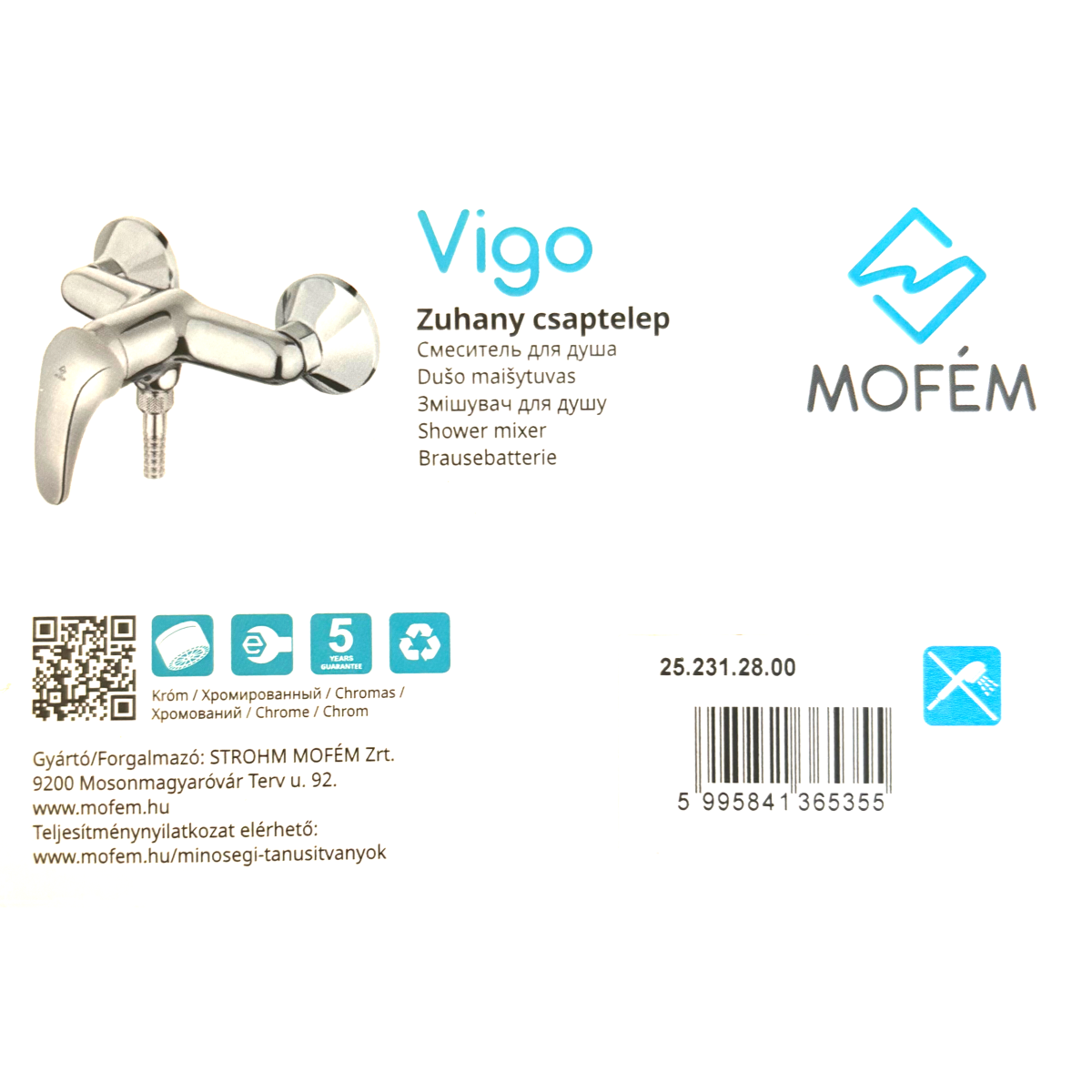 A Mofém Vigo egykaros zuhanycsaptelep letisztult, időtálló formavilágot képvisel, amely jól illeszkedik modern és klasszikus fürdőszobákba egyaránt. A króm felület egységes, könnyen tisztán tartható megjelenést ad, míg az egykaros kialakítás lehetővé teszi a vízhőmérséklet és a vízmennyiség egyszerű szabályozását. Fali kivitelű zuhanycsaptelep, szabványos fürdőszobai beépítéshez.