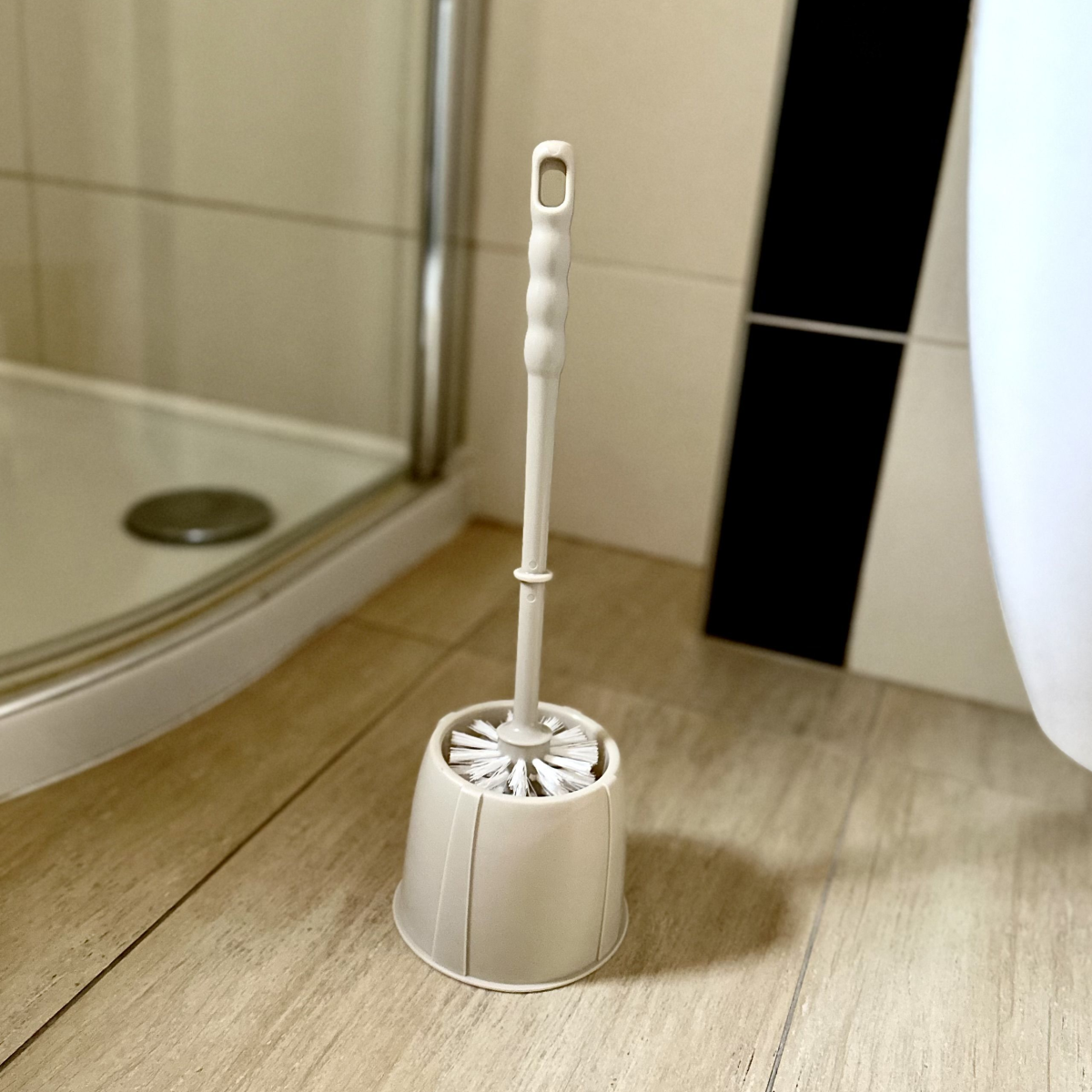 Lajta WC-garnitúra gömbölyű kefével bézs-barna színben 12x39x12 cm méretben. Anyaga: polipropilén.