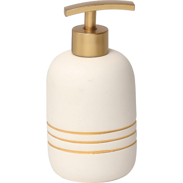 Szappanadagoló, kőhatású, bézs színben, arany csíkokkal. Színében harmonizál a család többi tagjával.