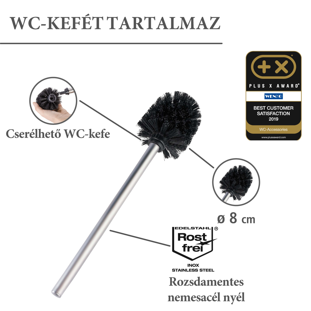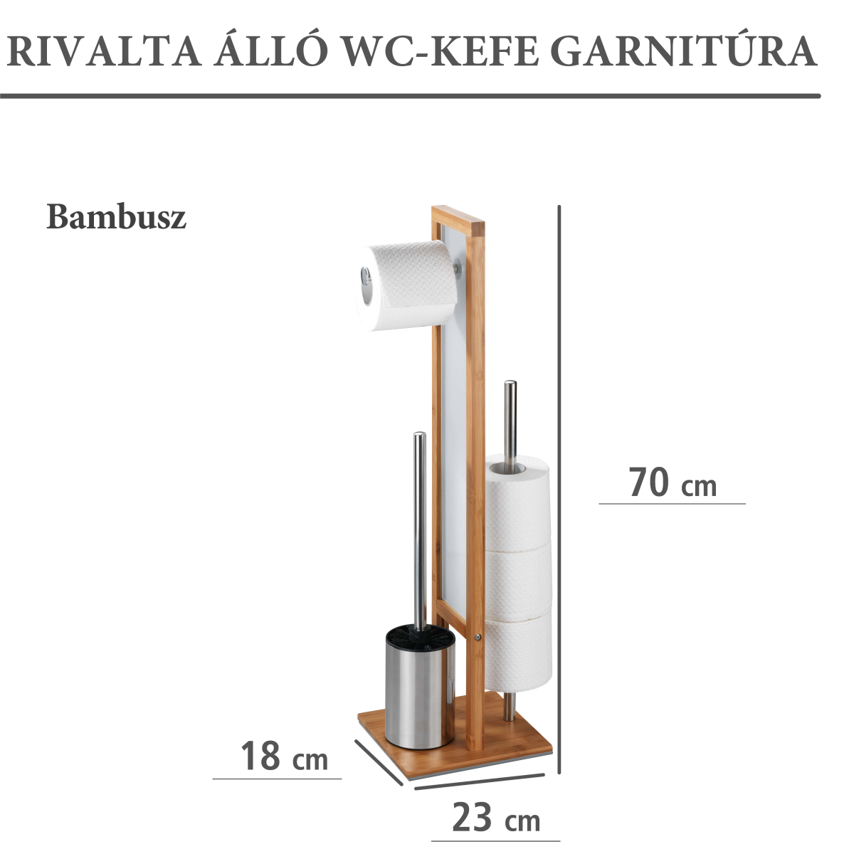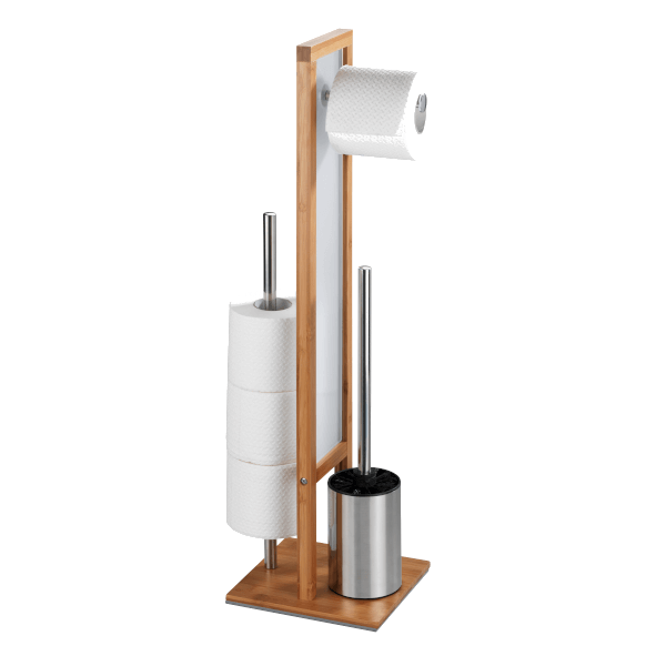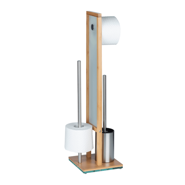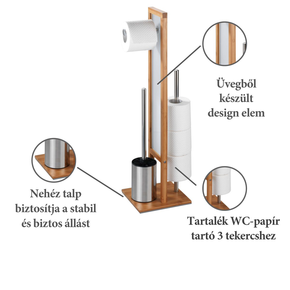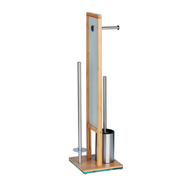 A stílusos és praktikus WC-kefe garnitúra 3 az 1-ben kombinációjának köszönhetően, nem kell falat fúrnia a WC-papír tartónak, a WC-kefét is helytakarékosan tárolhatja, és még a pót WC-papírokat (max. 3 db) is kéz közelben tarthatja. A bambusz gyorsan nő, így a környezettudatosság jegyében jó választás természetes alapanyagnak. A fehér biztonsági üveg dekoratív eleme a WC-kefe garnitúrának, stabilitást biztosít, és eltakarja a pót WC-papírokat. A fekete WC-kefe fej 8 cm átmérőjű.