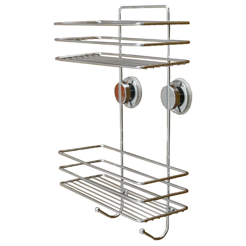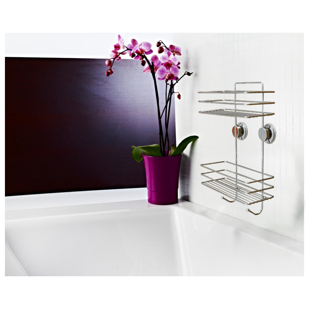 Öntapadós, műanyag piperepolc króm színben. Strapabíró műanyagból készült, ideális apróbb fürdőszobai piperetermékek tárolásához. Két szintes kialakítású, így ideális helykihasználást biztosít. Öntapadós, vákuumos technikával rögzül a falfelületre. Felhelyezés előtt ajánlott megtisztítani a felületet a szennyeződésektől a jobb rögzülés érdekében.