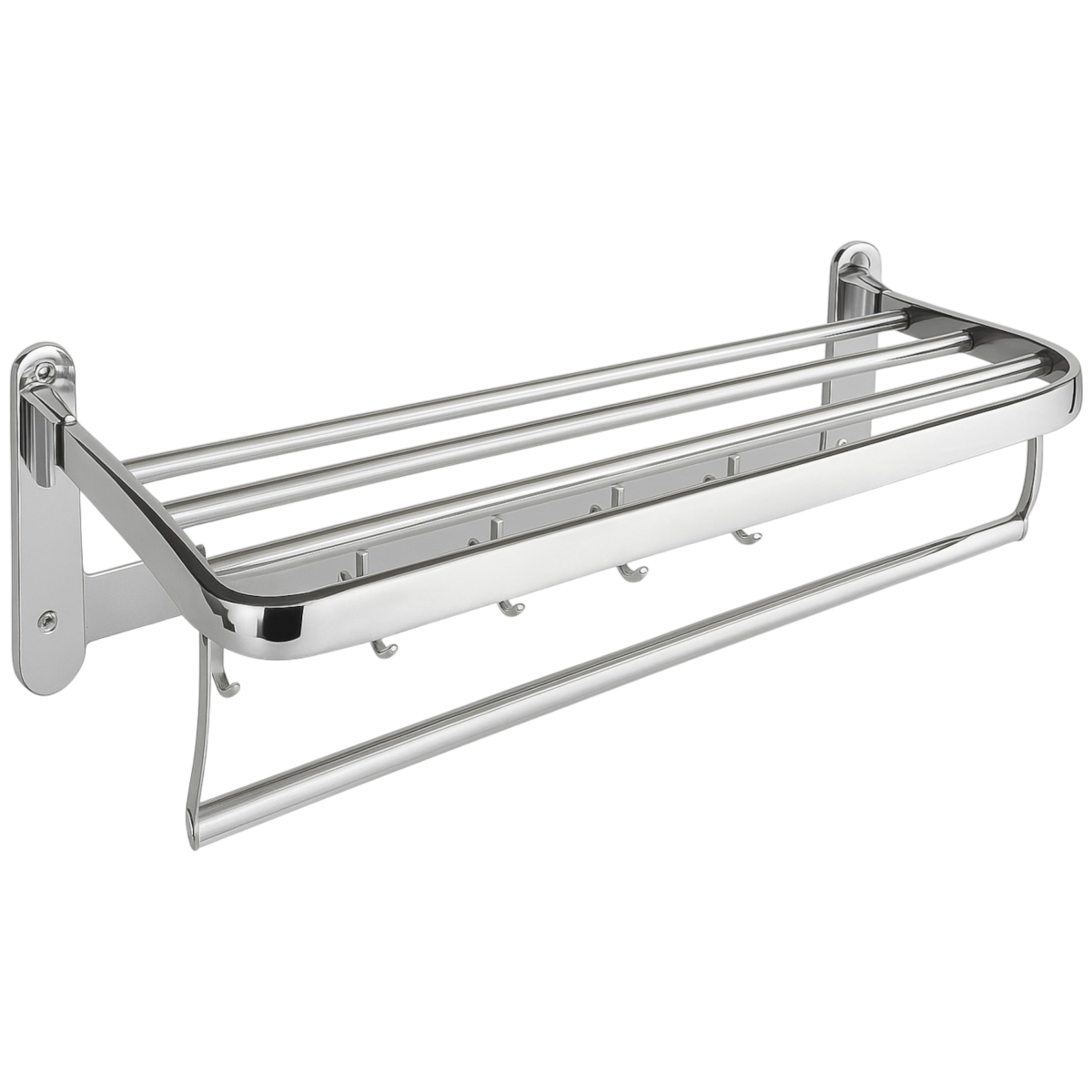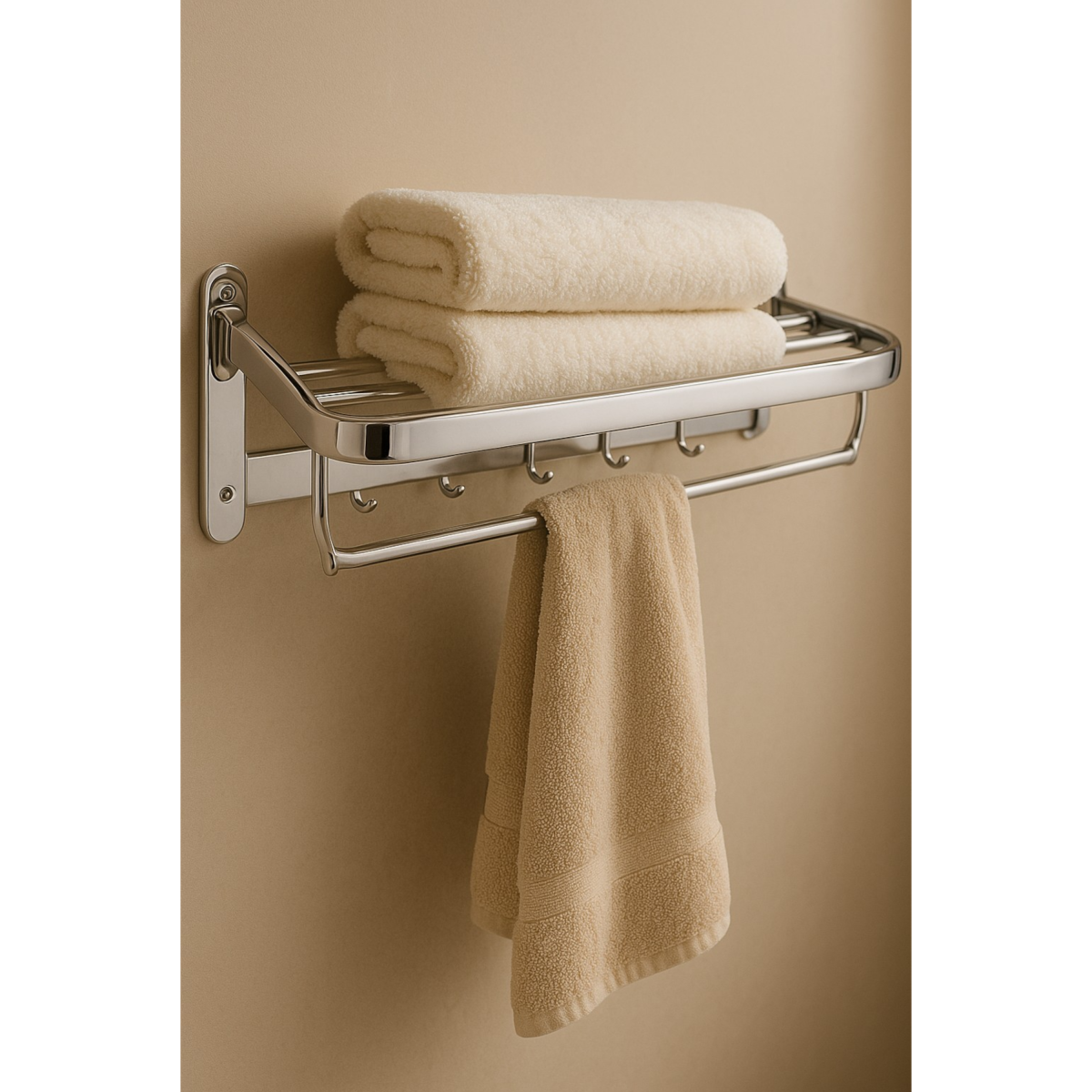 A felső polcrész több összehajtott törölköző tárolására alkalmas, az alsó rúd pedig ideális kéztörlők vagy fürdőlepedők felakasztásához.
