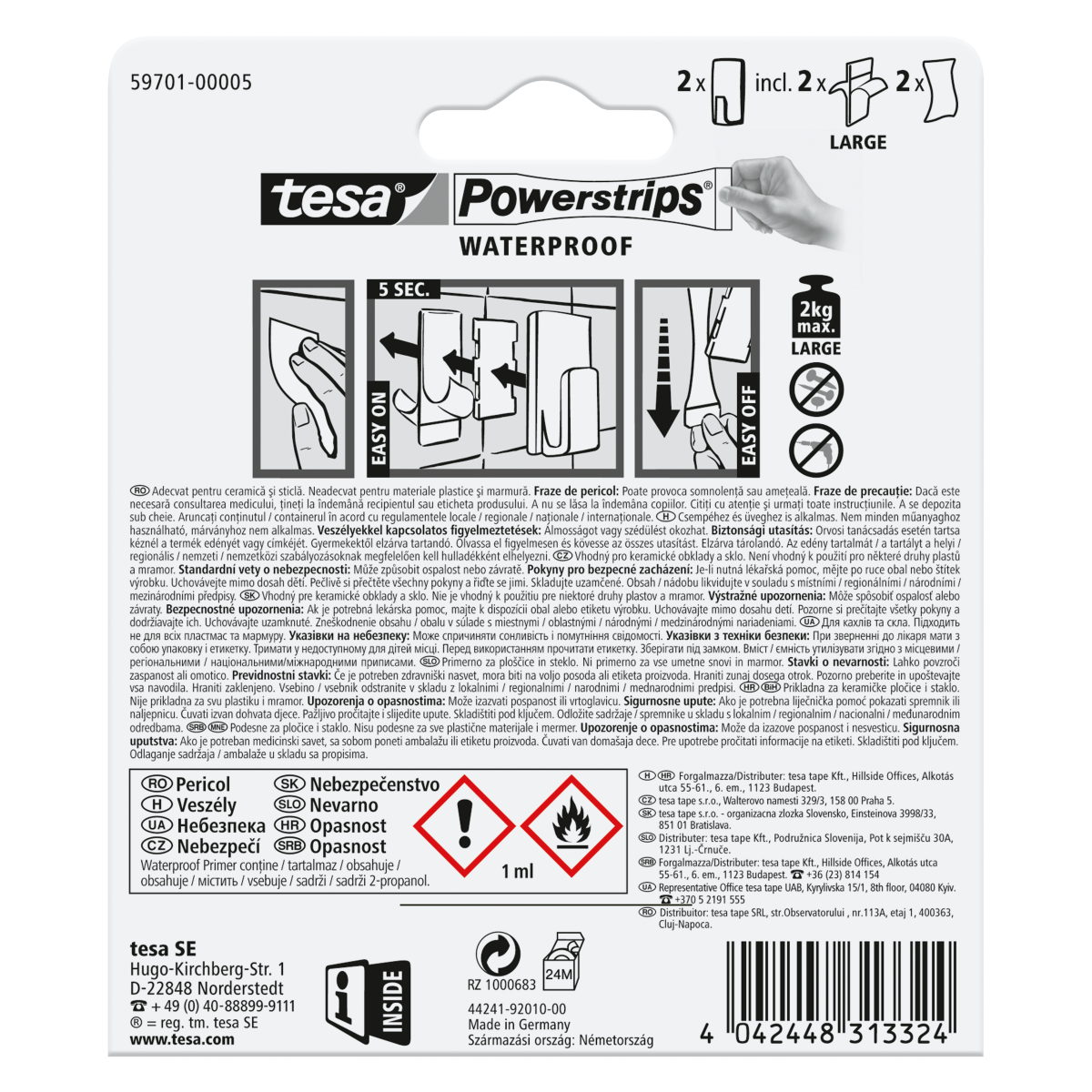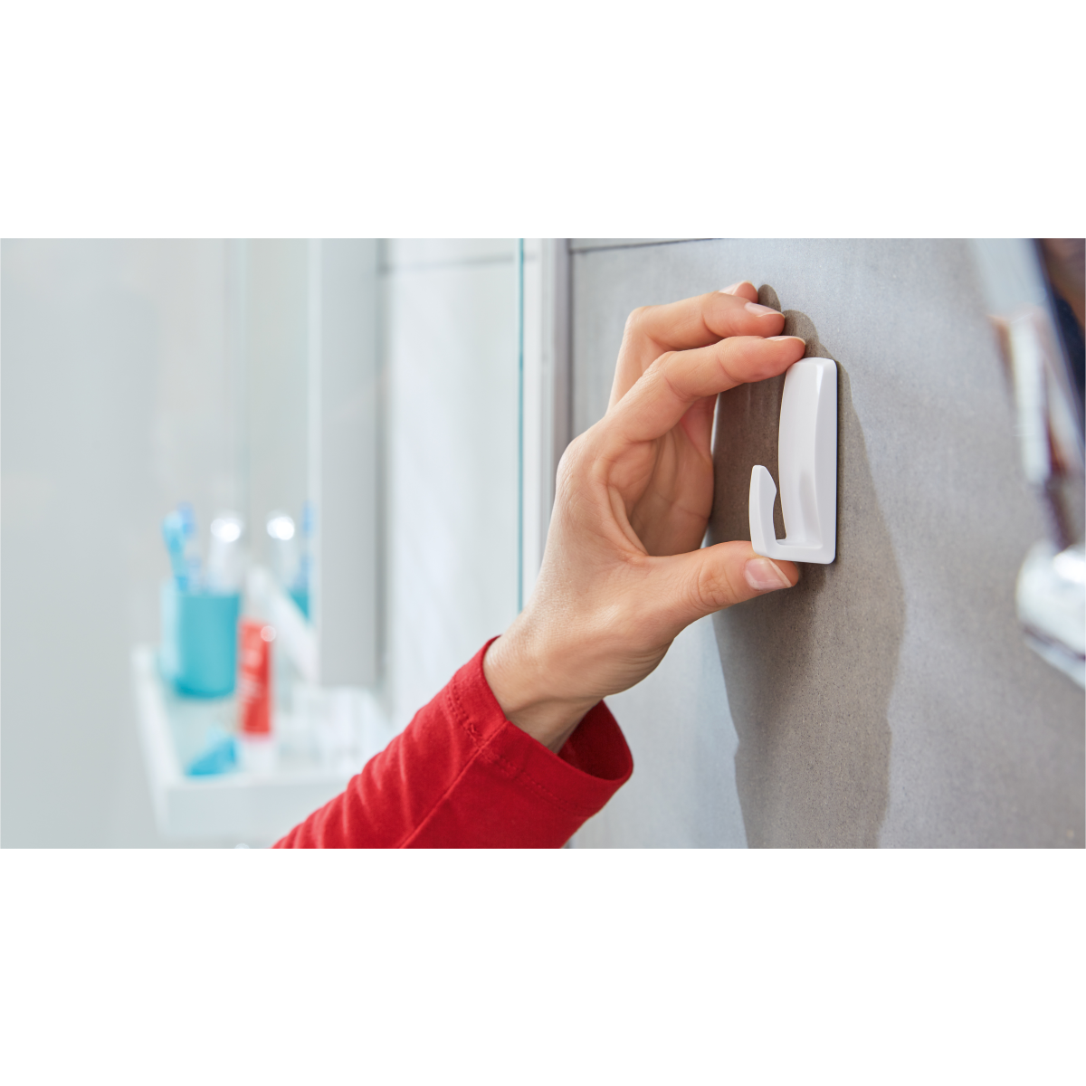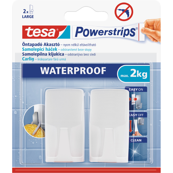 Az öntapadó tesa Powerstrips vízálló műanyag akasztó egy könnyen szerelhető, eltávolítható és újrafelhasználható akasztó, kifejezetten fürdőszobai használatra, 2 db/csomag kiszerelésben. Praktikus akasztó, ha közvetlenül a zuhany belsejében szeretnénk valamit felakasztani. Egyszerűen ragassza fel üvegre, csempére és bármilyen sima falfelületre*, és élvezze a sérülésmentes felakasztási megoldás előnyeit bármilyen legfeljebb 2 kg súlyú tárgy esetén. Ha meggondolná magát, mindössze néhány másodpercig tart, hogy eltávolítsa az akasztót. Nem alkalmas hungarocell vagy habosított anyagon, illetve tapadásmentes bevonattal ellátott felületeken, porózus anyagokon való használatra.