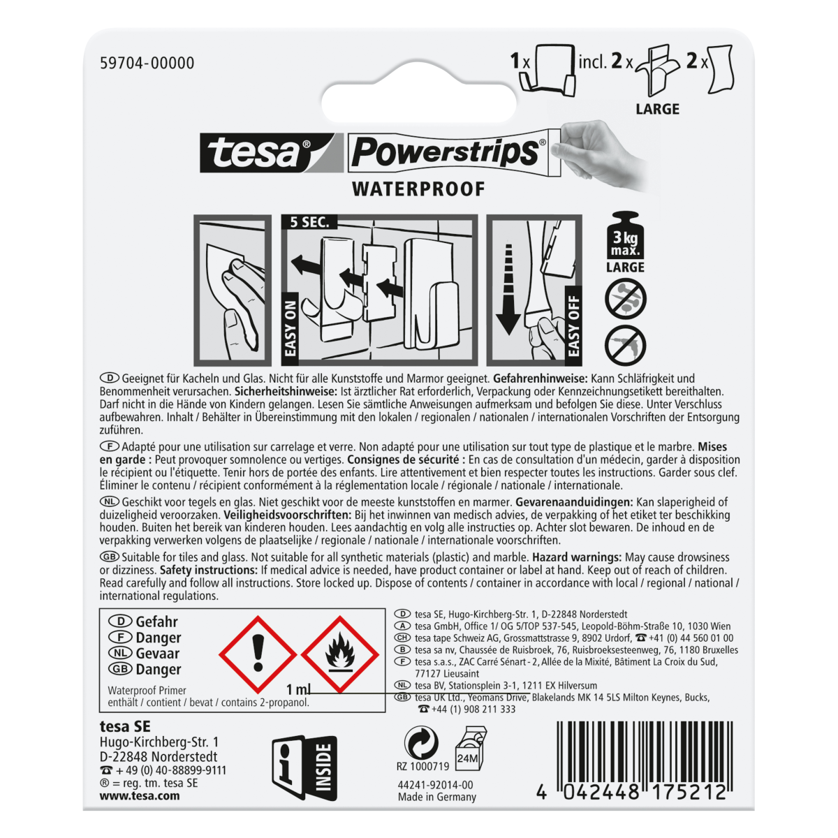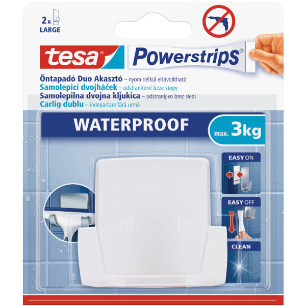 Használja az öntapadó tesa Powerstrips vízálló kettős akasztót a testápolási kellékek felakasztására közvetlenül a zuhanykabinban. Ez egy rendkívül sokoldalú tárolási eszköz, amely bármilyen max. 3 kg súlyú tárgy megtartására képes.* A vízálló Powerstrips technológiának köszönhetően ez az akasztó lehetővé teszi a sérülésmentes és eltávolítható rögzítést anélkül, hogy lyukakat kellene fúrnia. Eltávolításához csak le kell húzni a tesa Powerstrips vízálló ragasztócsíkot, és nem kell a nyomok miatt aggódnia. Nem alkalmas hungarocell vagy habosított anyagon, illetve tapadásmentes bevonattal ellátott felületeken, porózus anyagokon való használatra.