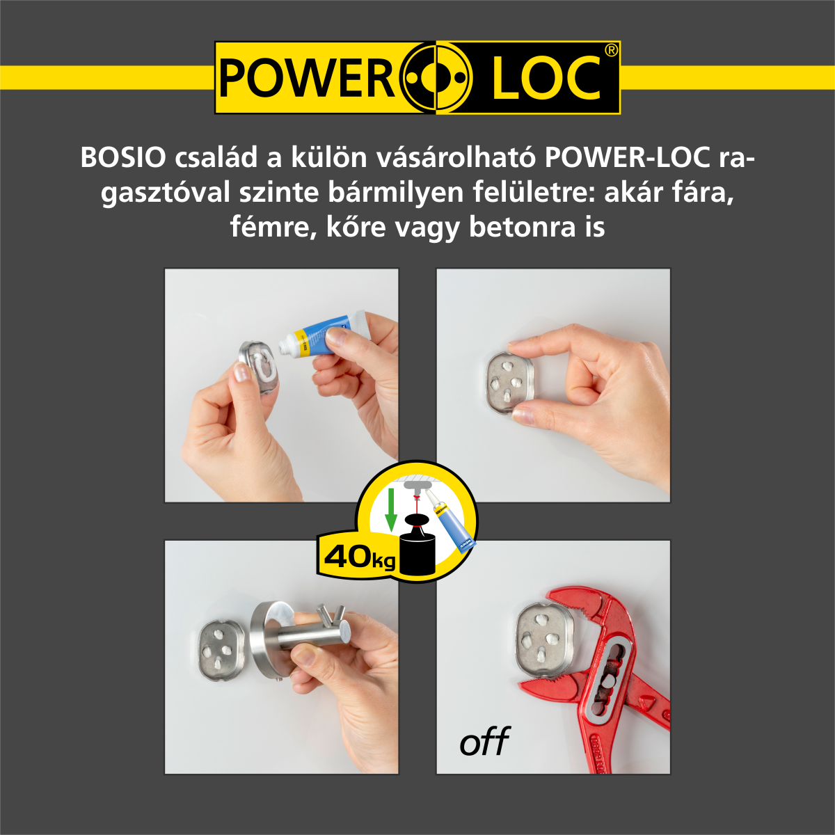 Innovatív és trendi fali kiegészítő. Fúrással is rögzíthető, a csavarokat és tipliket tartalmazza a csomag. De akár fúrás nélkül is rögzíthető bármilyen felületre (csempe, terméskő, beton, üveg, fém vagy fa) a Power-Loc ragasztó felhasználásával, ami külön vásárolható meg. Gyerekjáték a felrakása, húzza le a védőfóliát, helyezze fel a fali rögzítőt a kívánt helyre, és nyomjon bele a ragasztóból, amennyi szükséges. 6 óra a száradási idő után terhelhető. Anyaga: rozsdamentes nemesacél.