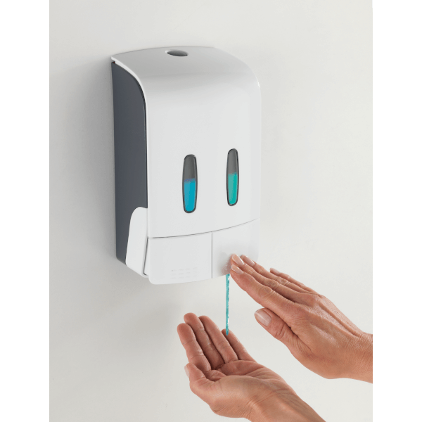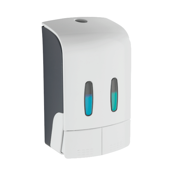 Tartas fertőtlenítőszer- és szappanadagoló, fehér színben, dupla. Mérete: 14,5x24x9 cm. Ideális fertőtlenítőszer- és szappanadagoló fürdőszobába, WC-be. Egy gombnyomásra elegendő mennyiségű szappant, fertőtlenítőszert, sampont, tusfürdőt, testápolót kaphat. A kémlelő ablakon keresztül mindig láthatja, hogy milyen szinten van a tartalma. Űrtartalma: 480 ml. A falra szereléshez tartalmazza a csavarokat és tipliket, illetve a kétoldalas ragasztó szalagot a fúrás nélküli rögzítéshez.