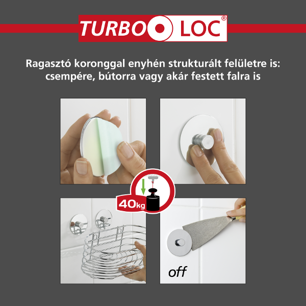 Innovatív és trendi fali kiegészítő fúrás nélküli rögzítéssel. A Turbo-Loc rögzítési rendszernek köszönhetően nem kell fúrnia, mégis jól tart akár enyhén struktúrált csempén vagy festett falon is. Gyerekjáték a felrakása! Először takarítsa le egy tiszta vizes törlőkendővel a felületet, és hagyja megszáradni, utána húzza le a védőfóliát, helyezze fel a falra a rögzítő adaptert, és nyomja rá, azonnal terhelhető illetve maradék nélkül eltávolítható. Anyaga: rozsdamentes nemesacél, színe: króm.