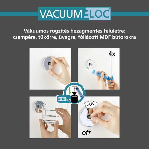 Innovatív és trendi fali kiegészítő fúrás nélküli rögzítéssel. A Vacuum-Loc rögzítési rendszernek köszönhetően nem kell fúrnia, mégis jól tart akár enyhén struktúrált felületeken is (csempe, tükör, üveg, fóliázott MDF bútorok). Gyerekjáték a felrakása, először takarítsa le egy tiszta vizes törlőkendővel a felületet, és hagyja megszáradni, utána húzza le a védőfóliát, helyezze fel a falra a rögzítő adaptert, tolja rá a középpontra a dugattyút a pumpával, és húzza ki a pumpát a dugattyúból, amíg pukkanó hangot nem hall, ezt ismételje meg még háromszor, azonnal terhelhető illetve bármikor áthelyezhető. Anyaga: rozsdamentes nemesacél, rögzítő: műanyag (ABS), színe: króm.