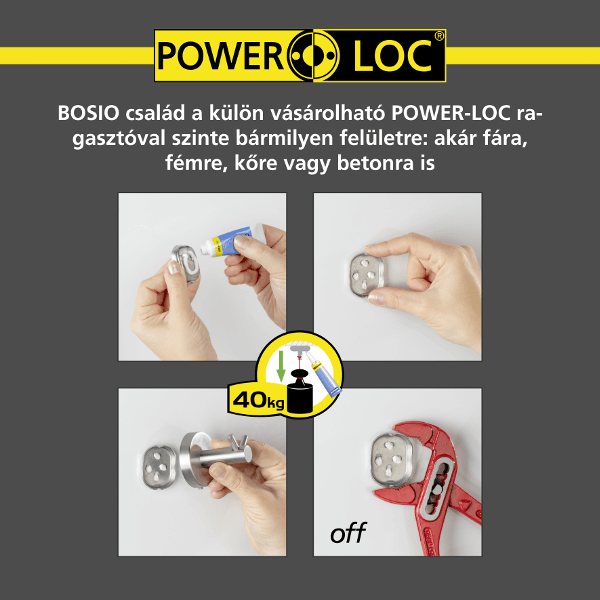 Innovatív és trendi fali kiegészítő. Fúrással is rögzíthető, a csavarokat és tipliket tartalmazza a csomag. Akár fúrás nélkül is rögzíthető bármilyen felületre (csempe, terméskő, beton, üveg, fém vagy fa) a Power-Loc ragasztó felhasználásával, ami külön vásárolható meg. Gyerekjáték a felrakása! Húzza le a védőfóliát, nyomjon a ragasztóból a fali rögzítőre, amennyi szükséges, és helyezze a kívánt helyre. 6 óra száradási idő után terhelhető. Anyaga: rozsdamentes nemesacél.