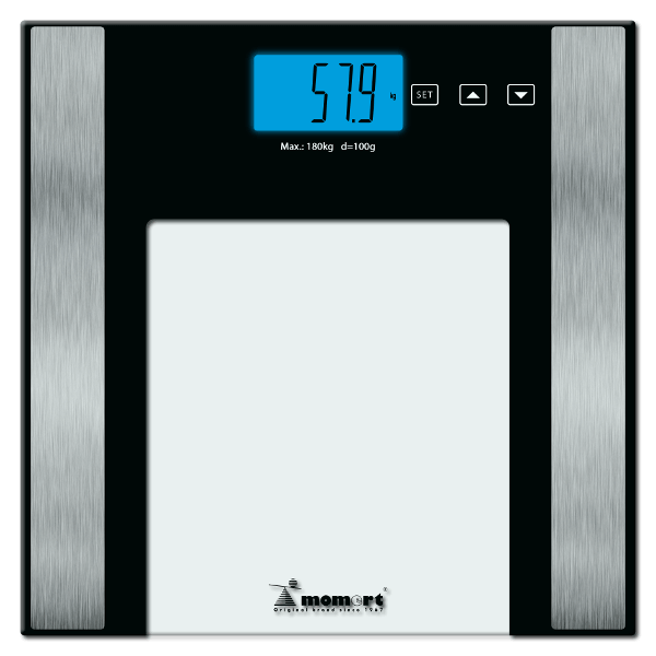 Momert testzsírmérős mérleg, mérési kapacitás: 180 kg, osztás: 100 g. Precíziós mérési rendszer, edzett biztonsági üveg felület. 7 funkció: testsúly, testzsír, testvíz, izomtömeg, csonttömeg, BMI testtömeg. Nagy LCD kijelző, kék háttérvilágítással, automatikus kikapcsolás.