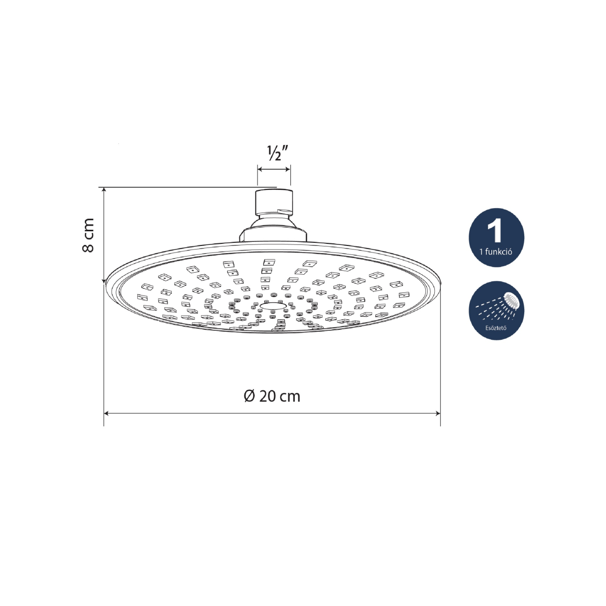 1 darab, esőztető funkciós zuhanyfej, mely könnyen tisztítható. 1/2"-os univerzális összekötővel rendelkezik.